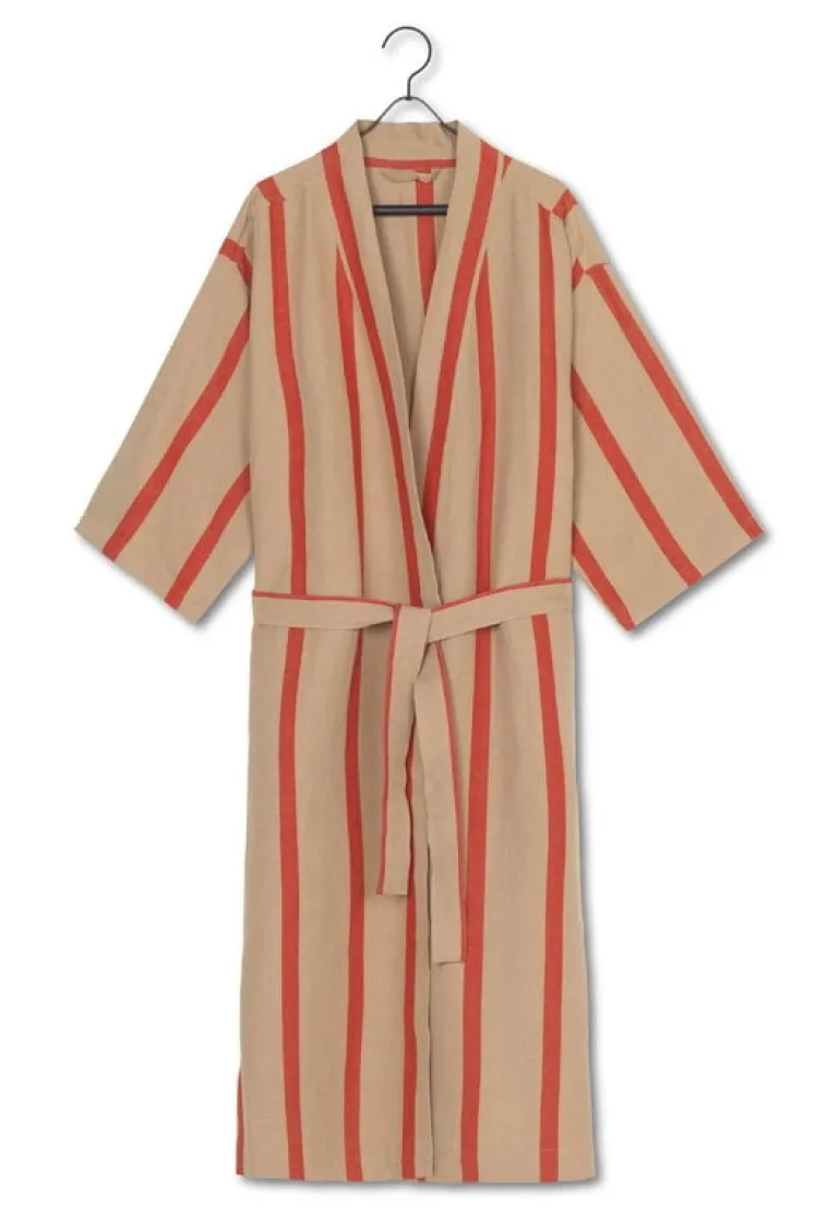 Morgonrocken Field från ferm LIVING gör att du känner dig lockad att koppla av en stund. Svep in dig i rocken och vakna till i din egen takt – eller njut av den avslappnande känslan efter bastun eller duschen lite längre. Morgonrocken Field har ett uppfriskande, randigt mönster med matchande skärp, vilket bara gör den vackra rocken än mer elegant. Den stunsiga blandningen av bomull och linne gör rocken lätt och snabbtorkande – den snygga morgonrocken Field är dessutom perfekt att ta med till stranden eller sommarstället.