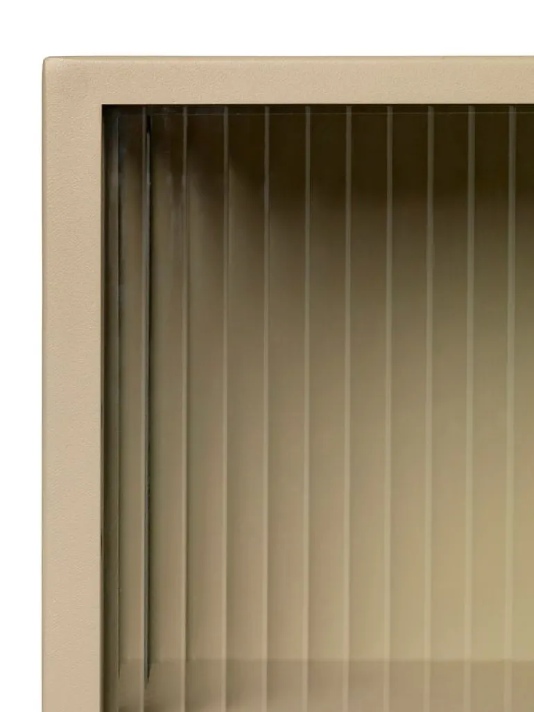 Ferm Livings Haze-kollektion kännetecknas av enkla snitt och grova, industriella material: arken av matt, ribbat glas ramas in av mjukt kashmir-färgad, pulverlackerad metall. Det kompakta Haze-skåpet har två metallhyllor som är perfekta för förvaring av badrumstillbehör eller kökets alla muggar och burkar.