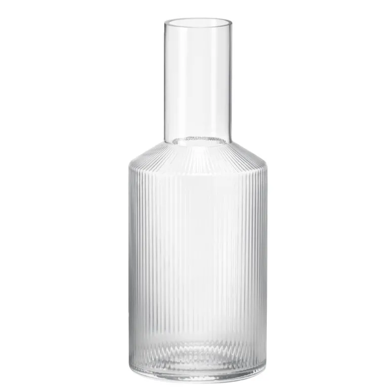 Ferm Livings Ripple-karaff är en vacker vattenkanna, saftkanna eller vinkaraff, och dess moderna men tidlösa utseende passar perfekt ihop med många typer av serviser. Karaffen är tillverkad av både slätt och räfflat glas och rymmer 9 dl.