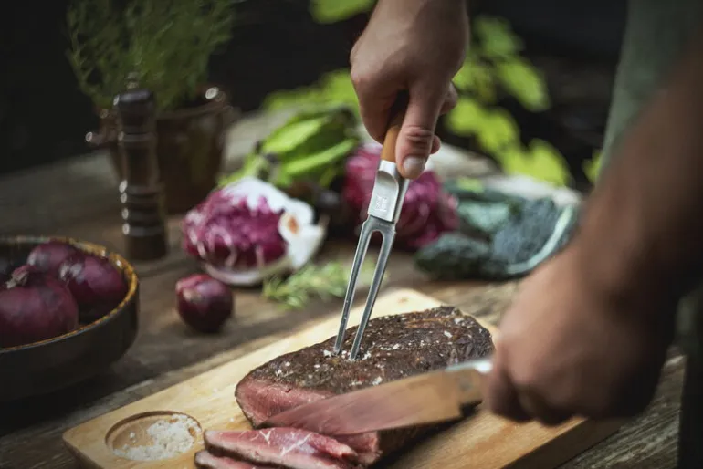 Stekgaffeln Norden från Fiskars hjälper dig att hålla steken på plats medan du skär upp den. Stekgaffeln är tillverkad i rostfritt stål av hög kvalitet och är försedd med ett handtag i björk. Träets naturliga variationer gör att varje exemplar är unikt.