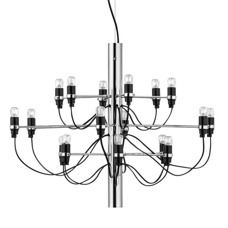 2097/18 är en unik ljuskrona designad av Gino Sarfatti för det italienska märket Flos år 1958. Den kromfärgade ramen i 2097/18 är omgiven av ett stämningsfullt kluster av 18 LED-lampor. Lampornas strömkablar har inte dolts, utan de fritt flödande kablarna är tvärtom ett viktigt element i ljuskronans design och ger den en mjuk och organisk karaktär. 2097/18 är en kombination av praktfullheten från traditionella ljuskronor och den modernistiska stilen från 1950-talet, med en touch av enkel och industriell estetik. Med en diameter på 70 cm drar 2097/18 blickarna till sig även i stora och öppna utrymmen, dess fint avvägda elegans passar till både klassisk och modern inredning.