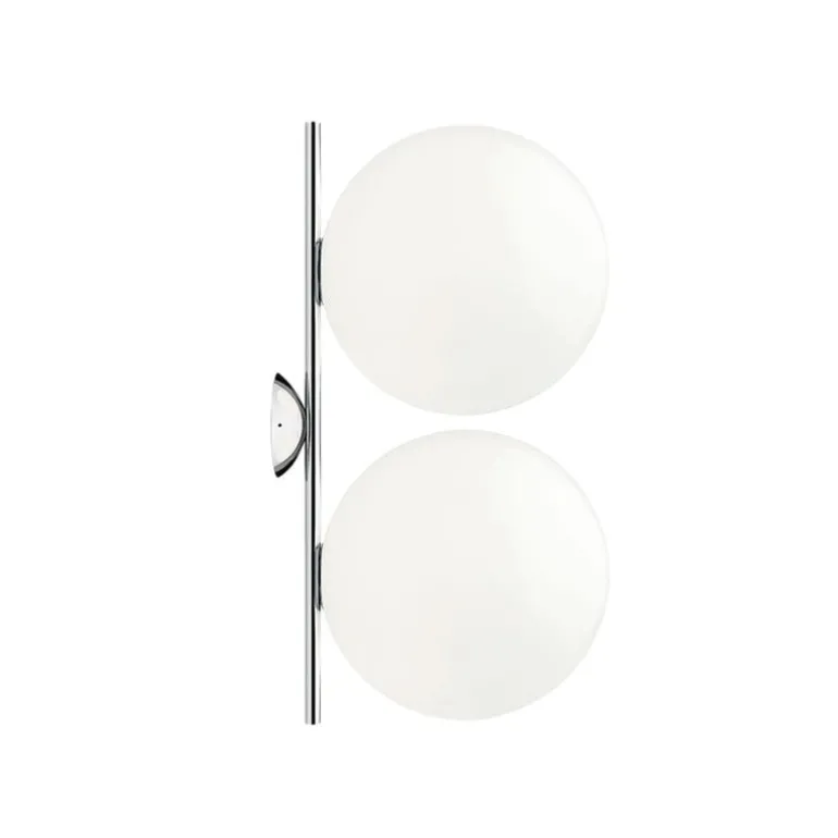 Vägg- och taklampan IC C/W2 Double, från det italienska märket Flos, är en del av IC-kollektionen som designades av Michael Anastassiades. Lampan karaktäriseras av en kombination av industriell enkelhet och elegant symbolism. Den består av en vinklad metallram med en elegant kromglans, samt två klot i vitt opalglas som ger ett rent, mjukt sken.