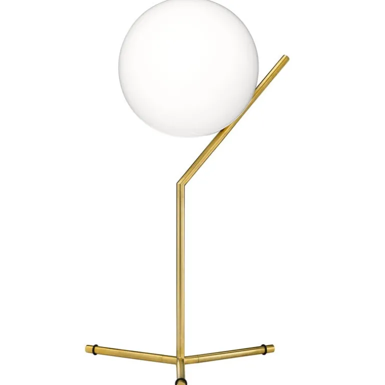Bordslampan IC T1 från det italienska märket Flos är en del av IC-kollektionen designad av Michael Anastassiades 2014. Armaturen har en karaktär av industriell enkelhet och elegant symbolism och består av en vinklad metallram i blank mässing och en rund diffusor i vitt opalglas som filtrerar ljuset på ett fint och mjukt sätt.