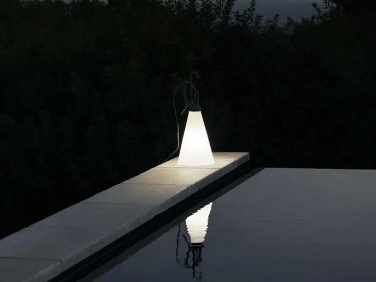 Mayday Outdoor, designad av Konstantin Grcic år 2000 för det italienska märket Flos, är en multifunktionell och glad väderbeständig lampa som kan användas som bordslampa eller hängas upp på en vägg- eller takkrok, både inomhus och utomhus. Lampan, som är tillverkad av hållbart återvunna material, är lätt och gjord av polypropen. Den är utrustad med en konformad, transparent diffusor och en krok/handtag som också fungerar som en sladdvinda. Tack vare sladdlängden på nästan fem meter är det enkelt att flytta Mayday från en plats till en annan när det behövs.