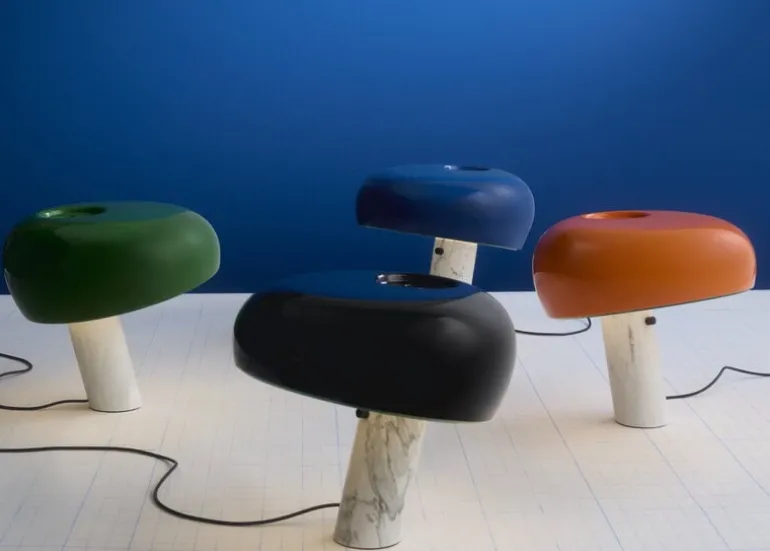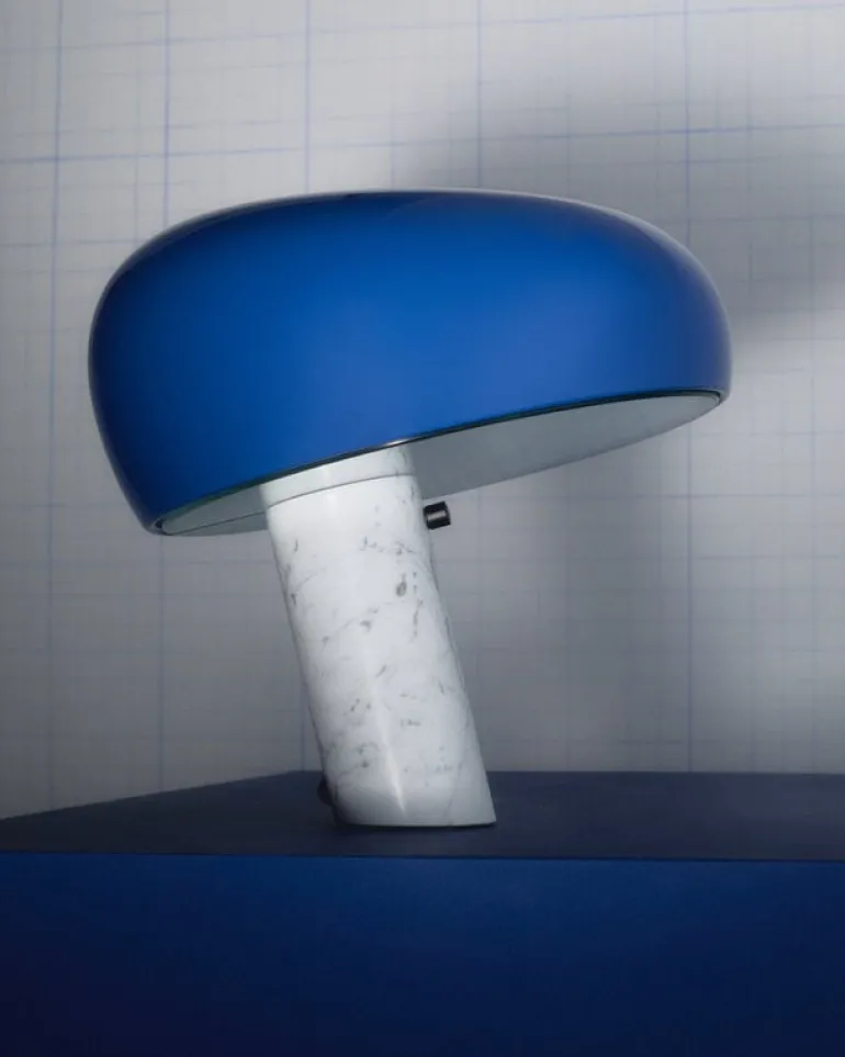 Bordslampan Snoopy från det italienska designmärket Flos kombinerar en vit marmorbas med en blå emaljerad metallskärm och en tjock glasskiva som försiktigt sprider ljuset. Den glada och eleganta bordslampan fick sitt namn efter hunden Snoopy i serien Knatte, Fnatte och Tjatte, eftersom reflektorn har en distinkt beagle-liknande silhuett. Den italienska arkitektduon Achille och Pier Giacomo Castiglioni designade Snoopy-lampan redan 1967, och Flos har uppdaterat lampan med en modern touch-sensor-dimmer.