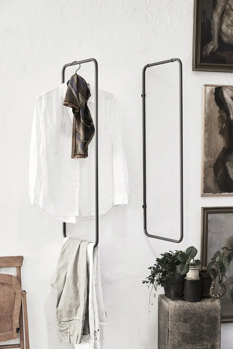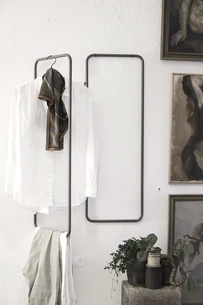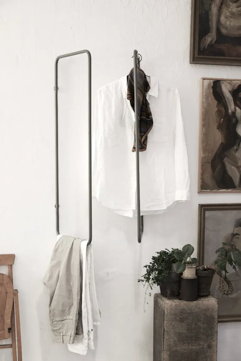 Den minimalistiska klädhängaren Turnaround från Fólk Reykjavik är ett idealiskt val för små utrymmen, eftersom den kan vinklas in plant mot väggen. Den enkla, rektangulära stålrörsramen är lätt, okrossbar och lätt att installera med endast två skruvar. Placera hängaren Turnaround i hallen, badrummet eller bakom sovrumsdörren – eller skapa en hel bok med kläder genom att använda flera hängare.