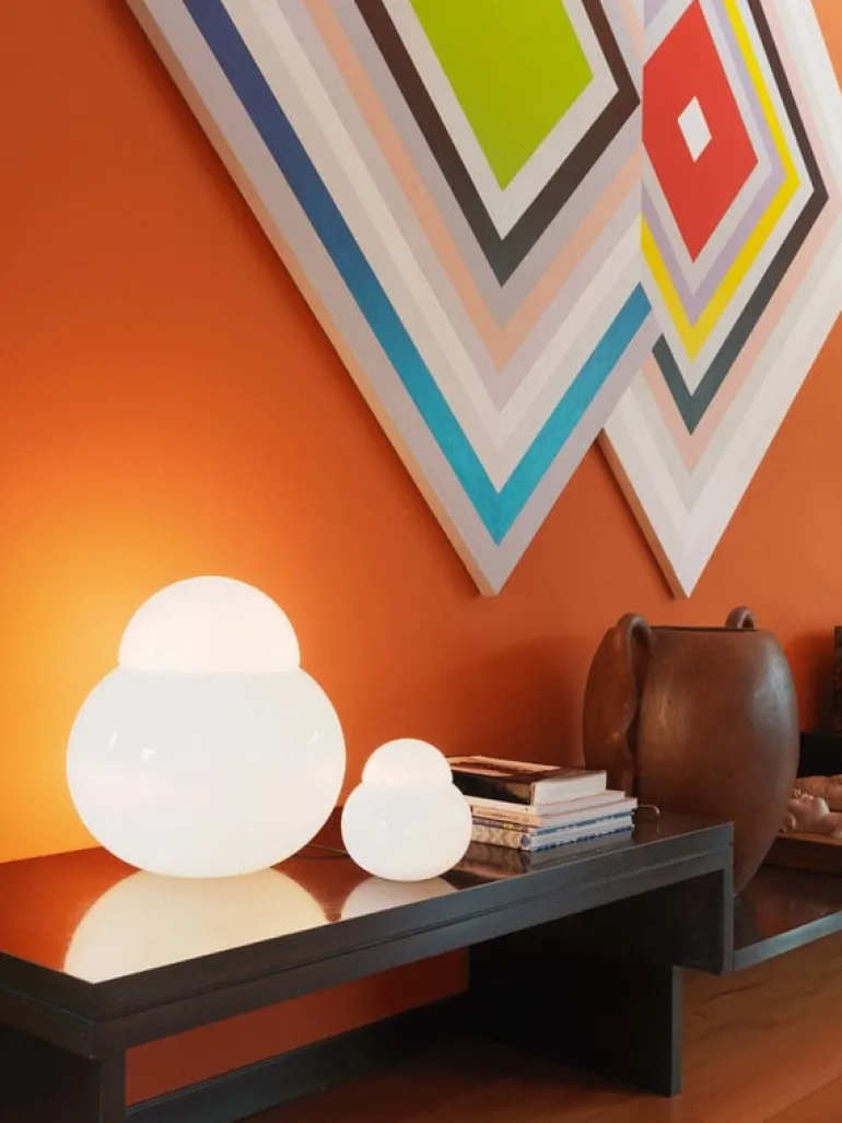 Daruma är en rolig, enkel och elegant bordslampa som Sergio Asti skapade för FontanaArte 1968. Istället för en separat lampfot och en skärm består Daruma av två glasglober som sitter ihop – det vita glaset gör att det sprids ett mjukt ljus runt hela lampkroppen. Daruma, som visas på MoMA i New York, är en av pärlorna i 1960-talets italienska belysningsdesign. Dess distinkta karaktär gör att den älskas och används än idag.