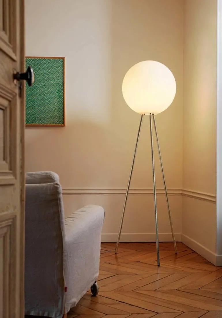 Golvlampan Prima Signora från FontanaArte är ett elegant mästerverk som formgavs av Daniela Puppa 1992. Prima Signoras sfäriska skärm är tillverkad av vitt opalglas och den eleganta stativbasen är av förkromad metall. Lampan är dimbar och ljuset skapar en behaglig atmosfär, till exempel i sovrummet, men Prima Signora visar lika gärna upp sig i vardagsrummet, i en lobby eller på kontoret.