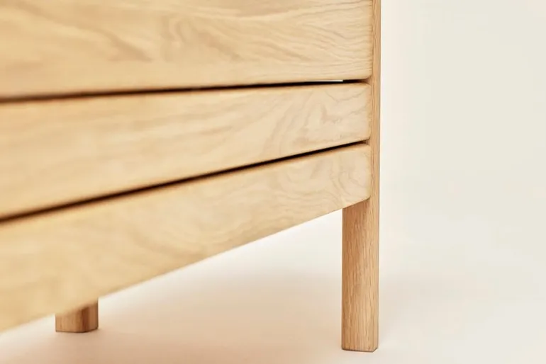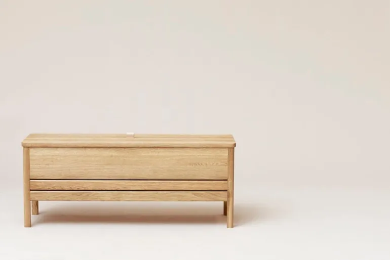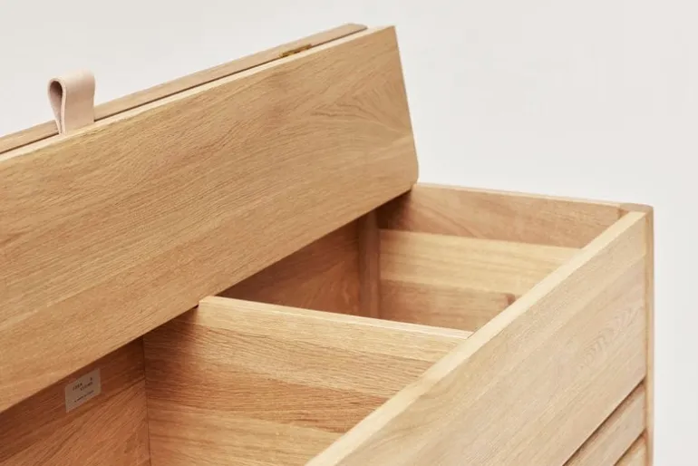 Form & Refines A Line-förvaringsbänk har konstruerats av massiv ek och toppats med ett läderhandtag på locket. När bänken öppnas viks locket snyggt ihop bak på bänken och avslöjar de två förvaringssektionerna inuti. Sektionerna kan användas för att lagra dylika saker, exempelvis skor och tillbehör i hallen, lakan i sovrummet eller förnödenheter i kontoret.