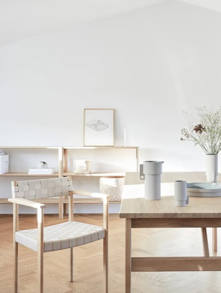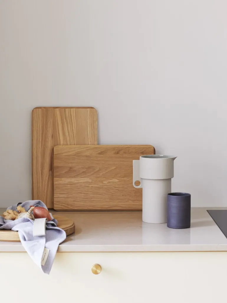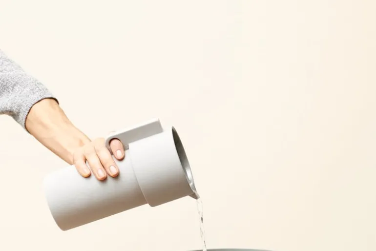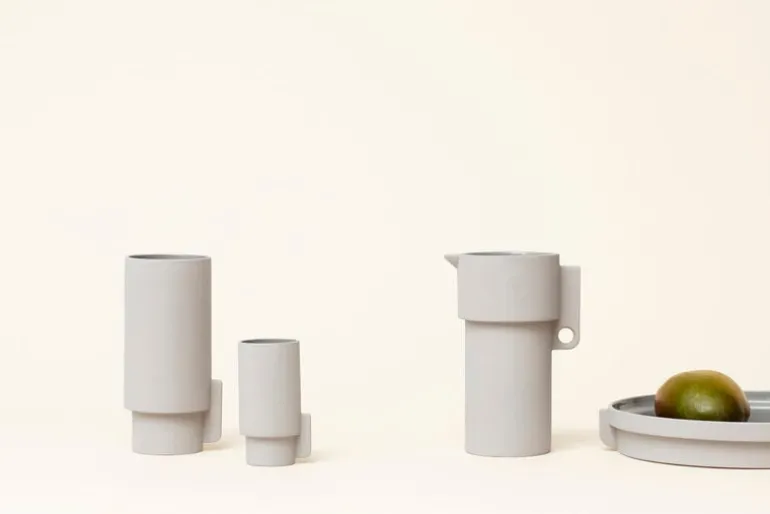 Alcoakaraffen, med design av Herman Studio för Form & Refine, är en del i en keramikkollektion baserad på geometriska linjer med kontraster mellan glansiga och matta ytor. Insidan av artiklarna har fått en glansig glasering medan den ljusgråa utsidan fått en matt glasering.