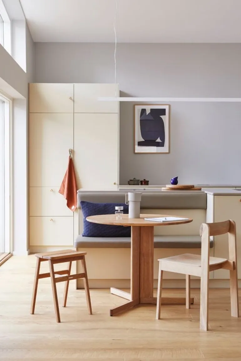 Bordet Trefoil, som är designat av Herman Studio för Form & Refine, är ett matbord i massiv ek för både hemmet och restaurangen, eller andra offentliga utrymmen. Bordet Trefoil består av en rund bordsskiva och en trefotad bas med tre sammansatta ben. Det ger bordet en vacker och igenkännbar silhuett. Diametern på 75 cm gör Trefoil till ett utmärkt val även för mindre matplatser, och dess luftiga sammansättning lämnar gott om benutrymme under bordet. Ekens livfulla ådringsmönster gör varje bord helt unikt.