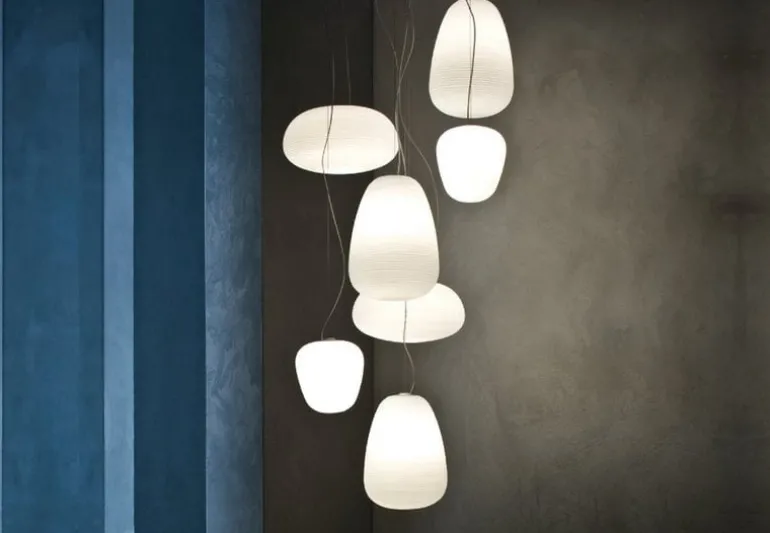 Foscarinis pendellampa Rituals 3, formgiven av Ludovica och Roberto Palomba, har en munblåst skärm av satinglas. Den naturligt vackra Rituals-lampan skapar ett varmt och mjukt glödande sken som för tankarna till traditionella japanska papperslyktor – bara materialet skiljer sig åt. Lamporna i Rituals-serien finns i flera olika former och varianter, och de drar till sig blickarna både individuellt och i grupp om flera ljuskällor.