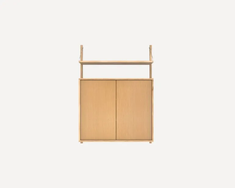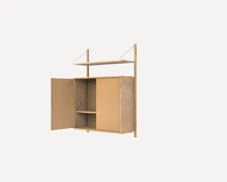 Framas vägghylla Shelf Library består av ett massivt ek-skåp och en hylla som fästs vid ramen med dekorativa stålskruvar och konsoler. Hyllan och skåpet kan flyttas runt och placeras på skenorna som du vill, och konfigurationen kan också anpassas med tillägg. Skåpet har ett push-öppningssystem med en hylla dold bakom dess dörrar. Designad av Kim Richardt, är det tidlösa, mångsidiga och anpassningsbara hyllsystemet lika väl lämpat för köket, vardagsrummet samt kontoret.