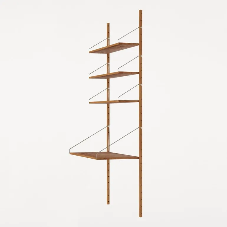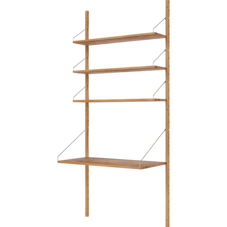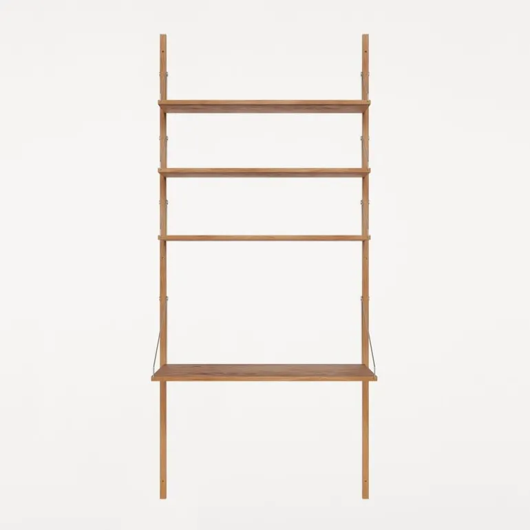 Framas vägghylla Shelf Library består av solida ekhyllor och ett skrivbord som fästs vid ramen med dekorativa stålskruvar och konsoler. Hyllorna och skrivbordet kan flyttas runt och placeras på skenorna som du vill, och konfigurationen kan också anpassas med tillägg. Designad av Kim Richardt, är den tidlösa, mångsidiga och anpassningsbara hyllan lika väl lämpad för köket, vardagsrummet samt kontoret.