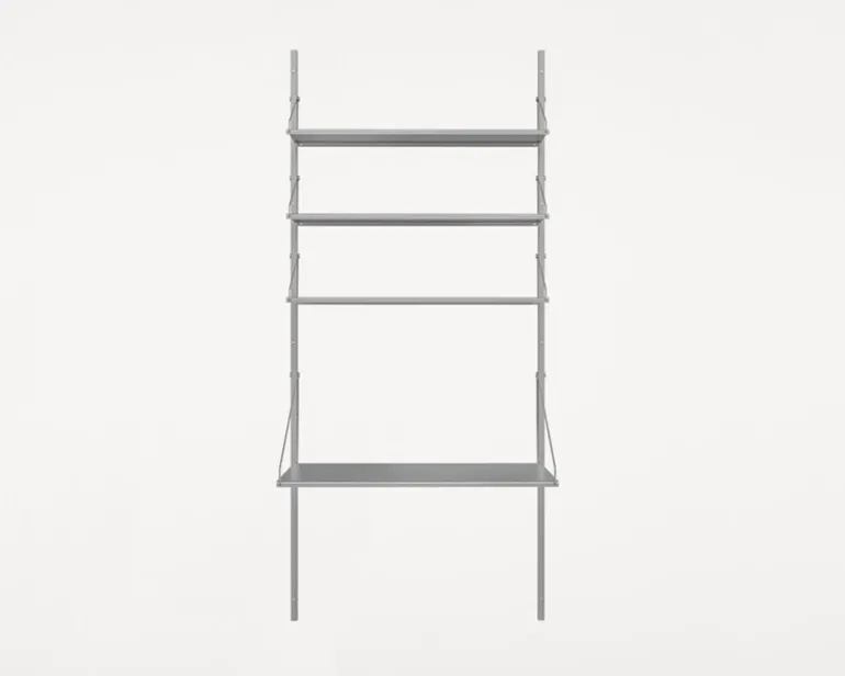 Framas vägghylla Shelf Library kännetecknas av en distinkt kombination av industriella material och ett tidlöst uttryck. Hyllan, som är designad av Kim Richardt, består av hyllplan och ett skrivbord i rostfritt stål som fästs vid ramen med dekorativa stålskruvar och konsoler. Hyllplanen och skrivbordet kan flyttas runt och placeras på skenorna som du vill, och konfigurationen kan också anpassas med tillägg. På grund av dess mångsidighet och anpassningsförmåga passar hyllan lika bra i köket, vardagsrummet som på kontoret.