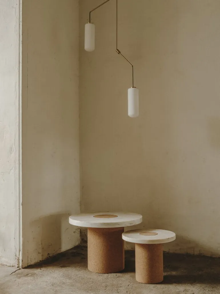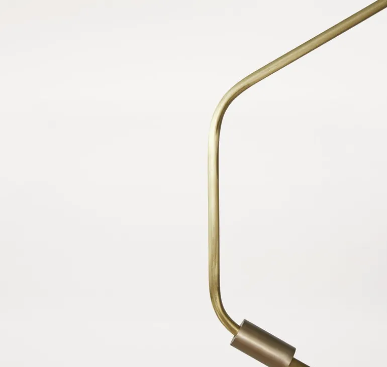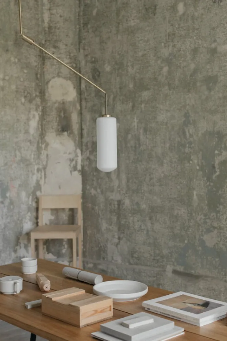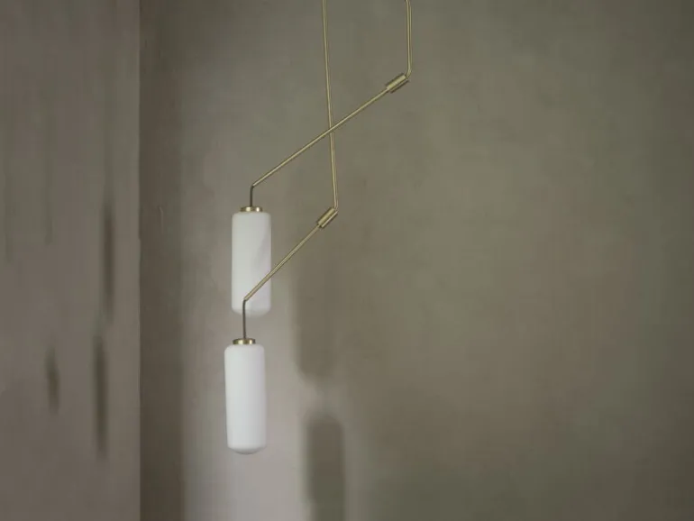 Frama’s hänglampa Ventus fångar blicken med sin arkitektoniska form, skapad av den danska designduon Included Middle. Hänglampan består av en skulpturalt böjd upphängningstube och en cylindrisk skärm i opalglas som filtrerar ljuset mjukt och behagligt, vilket skapar en varm och inbjudande atmosfär i rummet.