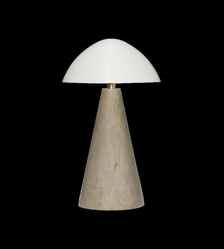 Fredericias bordslampa Fellow består av en distinkt kalkstensbas och en vit stålskärm med en böljande form. Fina detaljer och ett gyllene sken ger lampan en elegant touch. Bordslampan, som formgavs av Space Copenhagen, sprider ett mjukt sken och ser precis lika tjusig ut på ett sidobord i vardagsrummet som på nattduksbordet eller i offentliga miljöer.