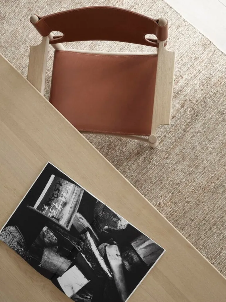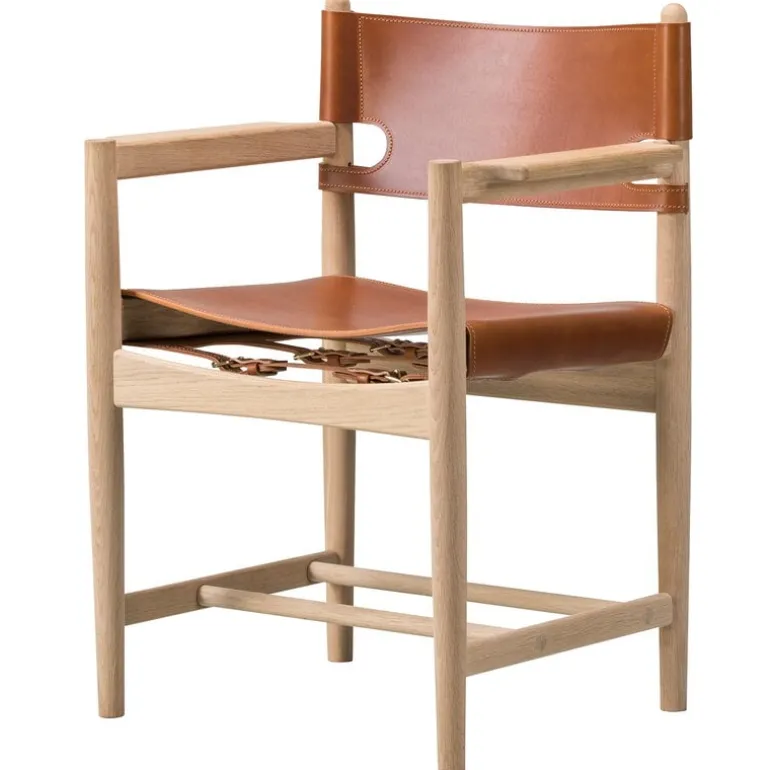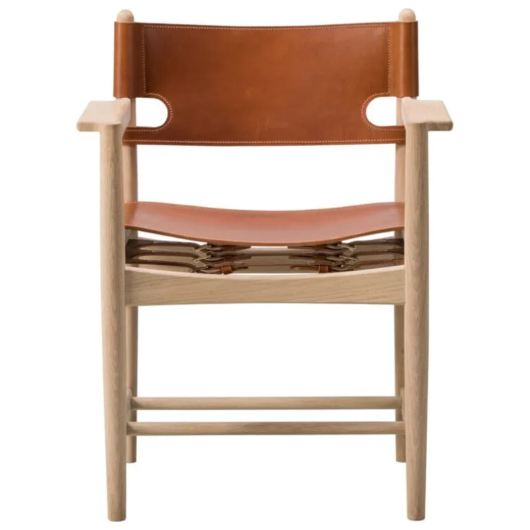 The Spanish Dining Chair från Fredericia formgavs av danske Børge Mogensen. Det är en matstolsvariant av den klassiska spanska stolen, The Spanish Chair, som han skapade 1958. När Mogensen designade stolarna inspirerades han av en medeltida spansk möbelteknik där sadelläder fästes på en solid träram. Han använde ofta den här tekniken i sina verk, även The Spanish Dining Chair består av en enkel ram i ek och vackert sadelläder som utgör sitsen och ryggstödet. Trots den enkla designen blir matstolen The Spanish Dining Chair ett blickfång i rummet med sitt tydliga uttryck som för tankarna till en jaktstuga. Stolen finns med och utan armstöd.
