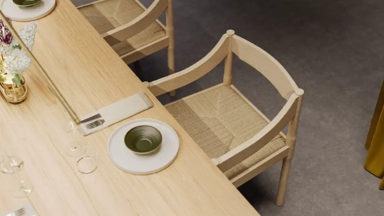 Charmen med Carimate-stolen ligger i dess starka, nästan lådliknande karaktär. Den sofistikerade silhuetten består av en ram i bok och en naturfärgad sits av papperssnöre. Kombinationen ger stolen ett robust men samtidigt luftigt och igenkännbart utseende som passar lika bra i matrummet som i vardagsrummet.
