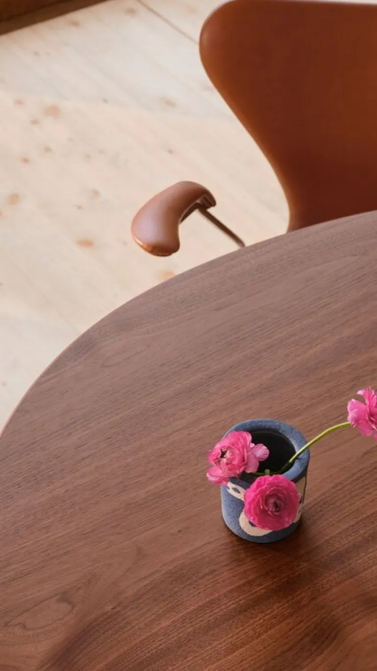 Fritz Hansens bord Egg har en mild, böjd design som kännetecknar Arne Jacobsens arbete. Den danska designern formgav ursprungligen det trebenta bordet för att kombineras med stolen Ant, men bordets minimalistiska elegans gör det tillräckligt mångsidigt för att synas i olika sittgrupper, oavsett om det är i köket där hemma eller på en restaurang. Kombinationen av en valnötsfanerad ovansida och kromade ben är lika modern och elegant nu som när den först introducerades 1952.