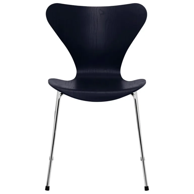 Den ergonomiska, ångböjda plywoodsitsen på stol 3107 består av nio lager askfanér. Den blåmålade ytan och de förkromade stålbenen ger stolen Series 7 3107 ett elegant utseende som skänker skandinavisk sofistikation till alla utrymmen.