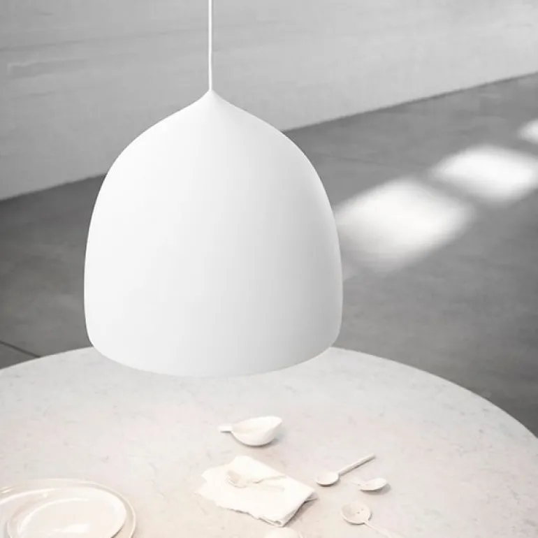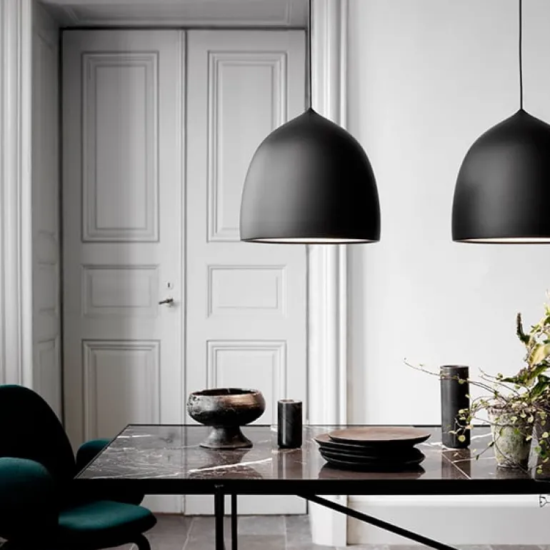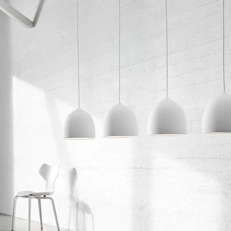 Pendellampan Suspence P2 från Fritz Hansen har en vacker aluminiumskärm med en form baserad på basala, fysiska rörelser: den lilla tippen på lampans topp ser ut som den skapats genom att någon dragit i sladden. Pendellampan är formgiven av GamFratesi och har en infinitydiffuser som koncentrerar ljuset, förhindrar bländning och skapar en optisk illusion av en öppen skärm. Med sin monokroma look och minimalistiska siluett är Suspence P2 väl lämpad för alla utrymmen och miljöer.