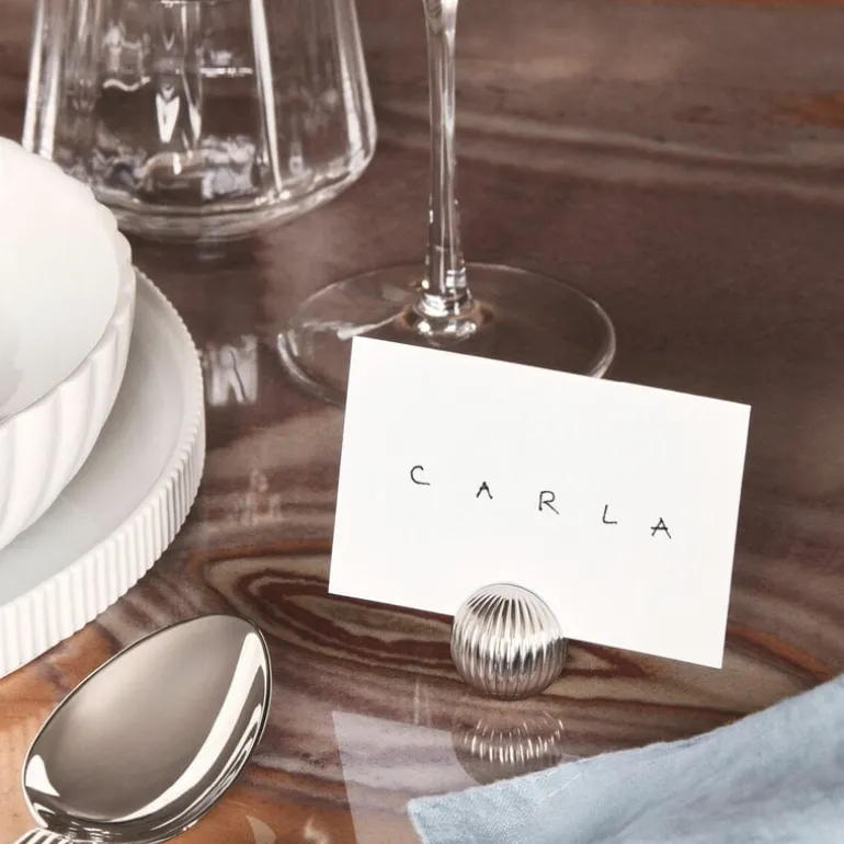 Georg Jensens smyckesliknande Bernadotte bordskortshållare är pricken över i:et på varje dukning. Den mjuka, eleganta stämningen som de krompläterade bordskortshållarna skapar bildar en intressant kontrast mot det intensiva materialet, vilket inbjuder till närmare granskning och samtal.
