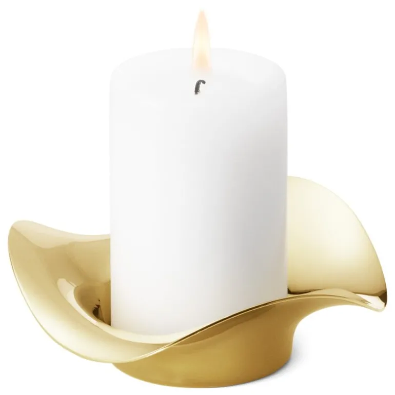 Georg Jensens pelarljushållare Cobra drar blickarna till sig med sin guldglänsande metallyta som reflekterar ljuslågorna på ett fängslande sätt. Ljushållarens organiska linjer påminner om smältande vax – nästan som om en klassisk ljusstake hade börjat smälta. Ljushållaren Cobra är utformad för bordsljus.