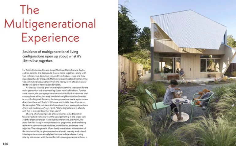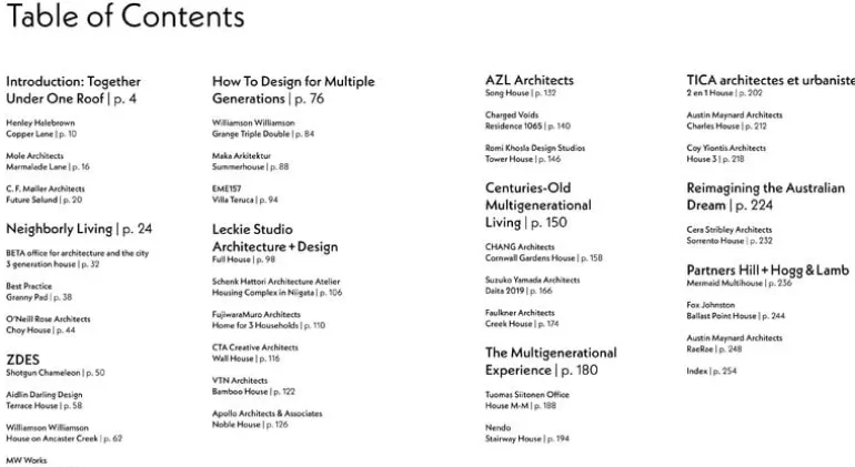 Come Together: Architecture of Multigenerational Living, utgavs av Gestalten och ger en intressant inblick i en gammal, idag mindre vanlig, form av gemensamt boende. I boken presenteras olika flergenerationshus och man studerar den moderna arkitekturens möjligheter att skapa harmoniska sätt för flera generationer att leva tillsammans med fördelar för alla. Boken har redigerats av Joann Plockova, en designjournalist som specialiserat sig på flergenerationsboende och som skriver för publikationer som New York Times, Monocle och Azure.