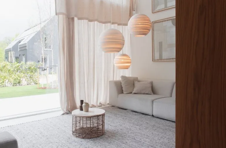 Moon-pendellampan från Graypants, ger ett mjukt, bländfritt sken som skapar en varm och välkomnande atmosfär för alla utrymmen och tillfällen. Korrugeringarna på pendellampans runda skärm, som är gjord av kartong, lyser upp på ett fascinerande sätt och ger lampan en unik struktur och utseende även när ljuset inte är tänt.