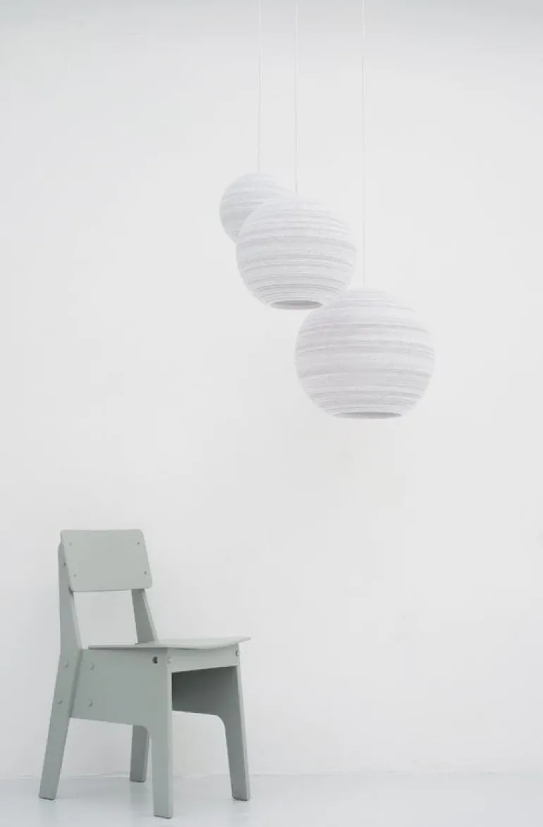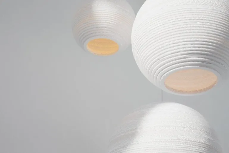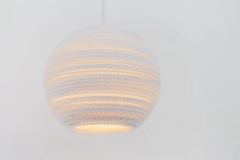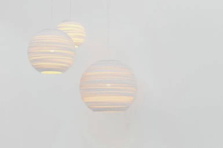 Moon är en del av Graypants kollektion Scraplights, som innehåller distinkta lampor gjorda av korrugerad kartong. Det helvita materialet, som är specialtillverkat, laserskärs och sätts ihop för hand med ett giftfritt lim till önskad form och avslutas med ett giftfritt brandskyddsmedel. Scraplights-pendellamporna är alla unika och hållbart tillverkade och de ger en naturlig, organisk touch till alla interiörer på egen hand eller i grupp.