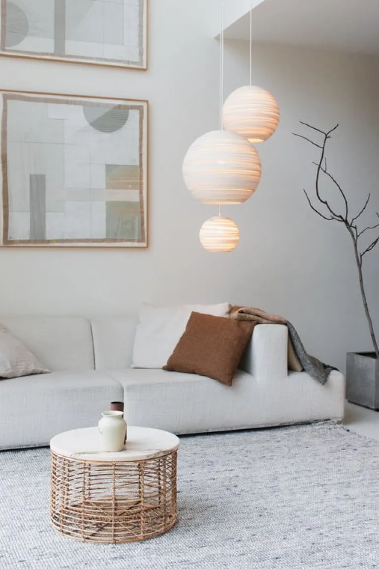 Moon-pendellampan från Graypants, ger ett mjukt, bländfritt sken som skapar en varm och välkomnande atmosfär för alla utrymmen och tillfällen. Korrugeringarna på pendellampans runda skärm, som är gjord av kartong, lyser upp på ett fascinerande sätt och ger lampan en unik struktur och utseende även när ljuset inte är tänt.