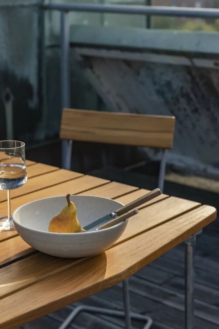 Grythyttan Stålmöblers stol 1 har berikat altaner, balkonger och trädgårdar med svensk kvalitet och design sedan 1930-talet – faktum är att den här stolen är lillebror till fåtölj A2, som en gång i tiden satte fart på framgångarna för det svenska företaget. Stol 1, som formgivits av Artur Lindqvist, har en smäcker stapelbar stålrörskonstruktion, som gör att den känns bekväm och lätt gungande att sitta i – oavsett vilken utemiljö du än placerar den. Den här utmärkande benkonstruktionen är ett återkommande inslag i många av Grythyttan Stålmöblers stolar. Med tiden kommer de galvaniserade delarna få en matt yta, medan det obehandlade teakträet kommer att få en vacker, silvergrå patina.