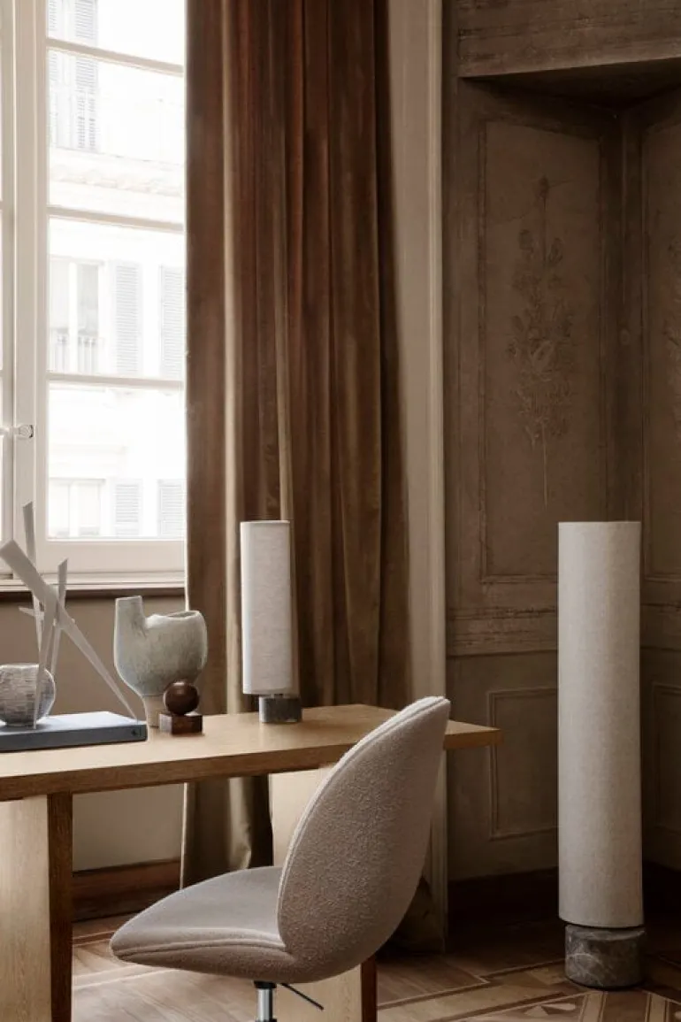 GUBI:s mötesstol Beetle ingår i en kollektion med eleganta och bekväma stolar som har formgivits av den dansk-italienska duon GamFratesi. Mötesstolen Beetle är utrustad med länkhjul, en smäcker fyrbent underdel och en helklädd sits. Höjden på kontorsstolen kan ställas in med en spak under sitsen, allt efter användarens smak och tycke.