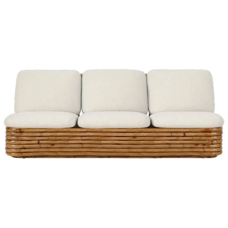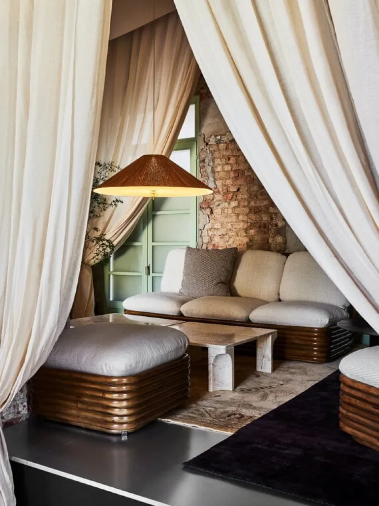 GUBI:s Bohemian-soffa är ett perfekt exempel på designer Gabriella Crespis önskan att skapa möbler som sömlöst kan flyttas från inomhus till utomhus. Soffan, som är tillverkad av rotting och klädd i Dedars högkvalitativa utomhustyg, passar lika bra i vardagsrummet som på balkongen eller den täckta terrassen eller uteplatsen – även om det inte rekommenderas att lämna rottingmöbler i regn eller brännande sol.