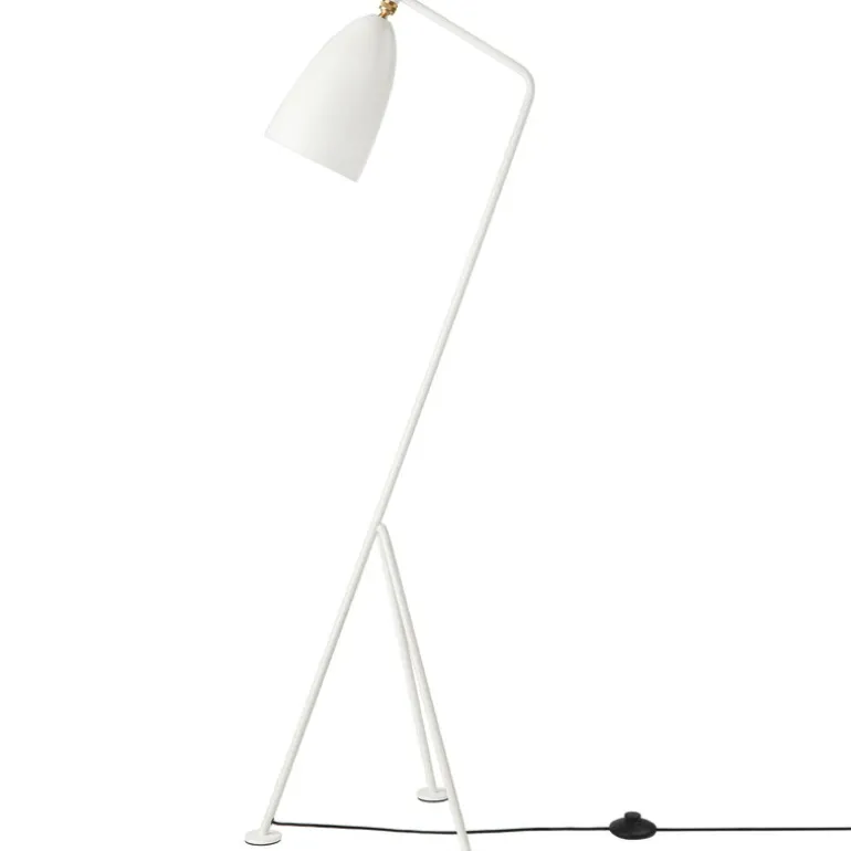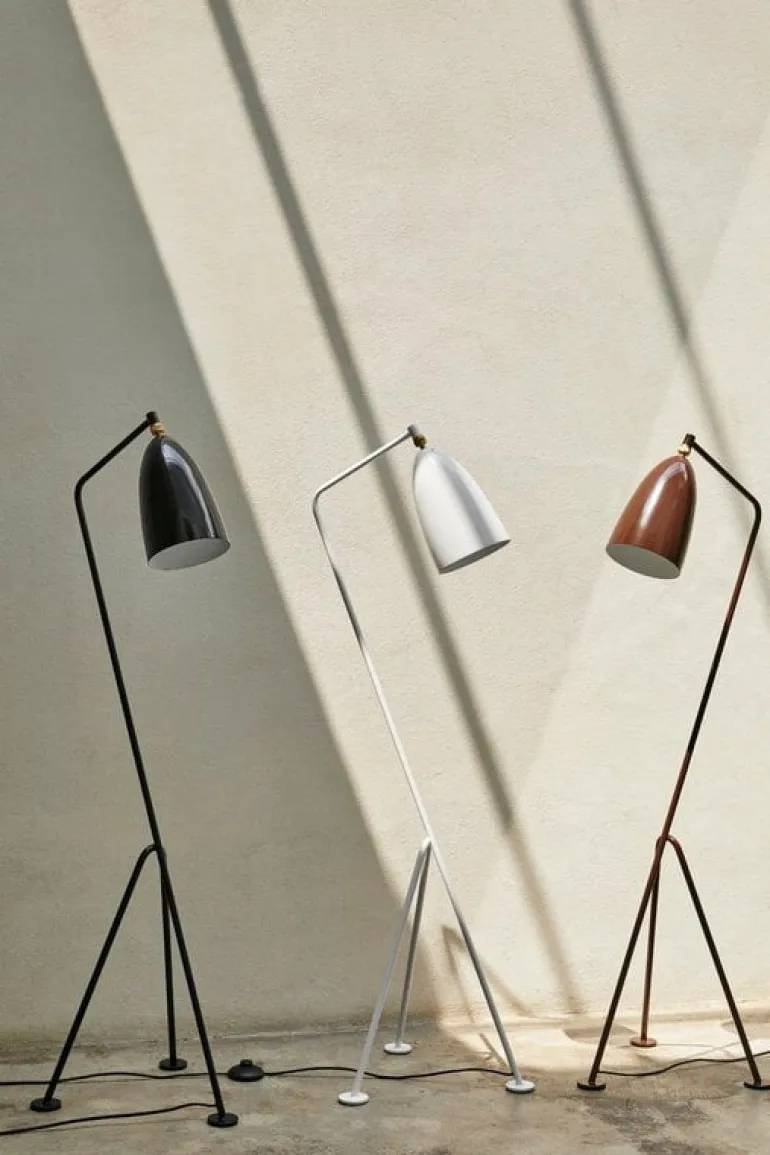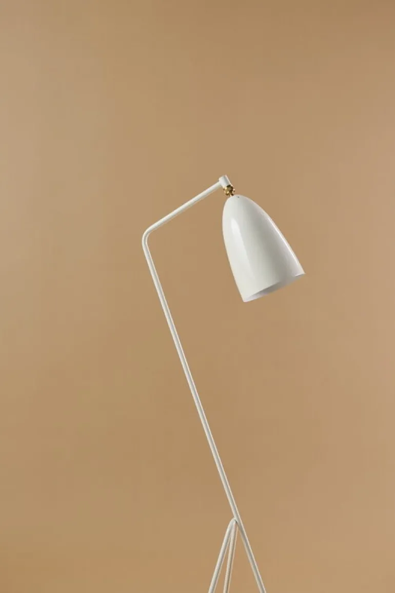 GUBI:s ikoniska golvlampa Gräshoppa, designad av Greta Magnusson, introducerades först 1947 och återutgavs 2011. Den signaturformade lampan har en enkel klockliknande skärm och en lutande tripod-bas med tre ben. Skärmen är monterad på armen med en kullagerled, så ljusriktningen är lätt att justera. Både stativet och skärmen på Gräshoppa-lampan är tillverkade av pulverlackerat stål.