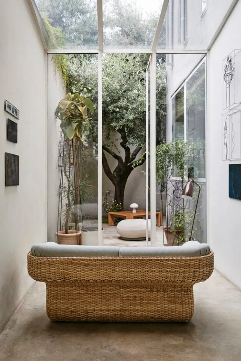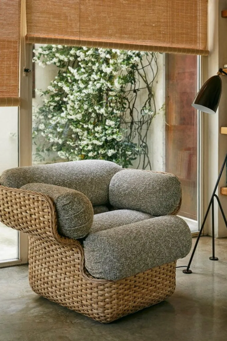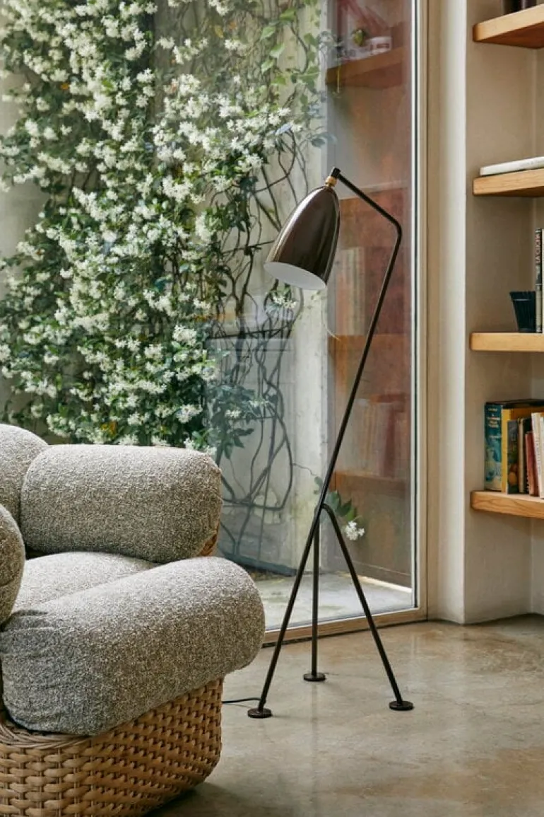 GUBI:s ikoniska golvlampa Gräshoppa, designad av Greta Magnusson, introducerades först 1947 och återutgavs 2011. Den signaturformade lampan har en enkel klockliknande skärm och en lutande tripod-bas med tre ben. Skärmen är monterad på armen med en kullagerled, så ljusets riktning är lätt att justera. Både ställningen och skärmen på Gräshoppa-lampan är tillverkade av pulverlackerat stål.