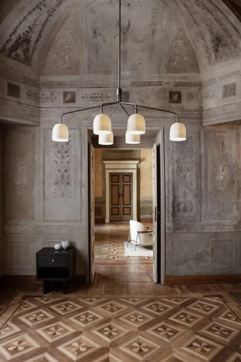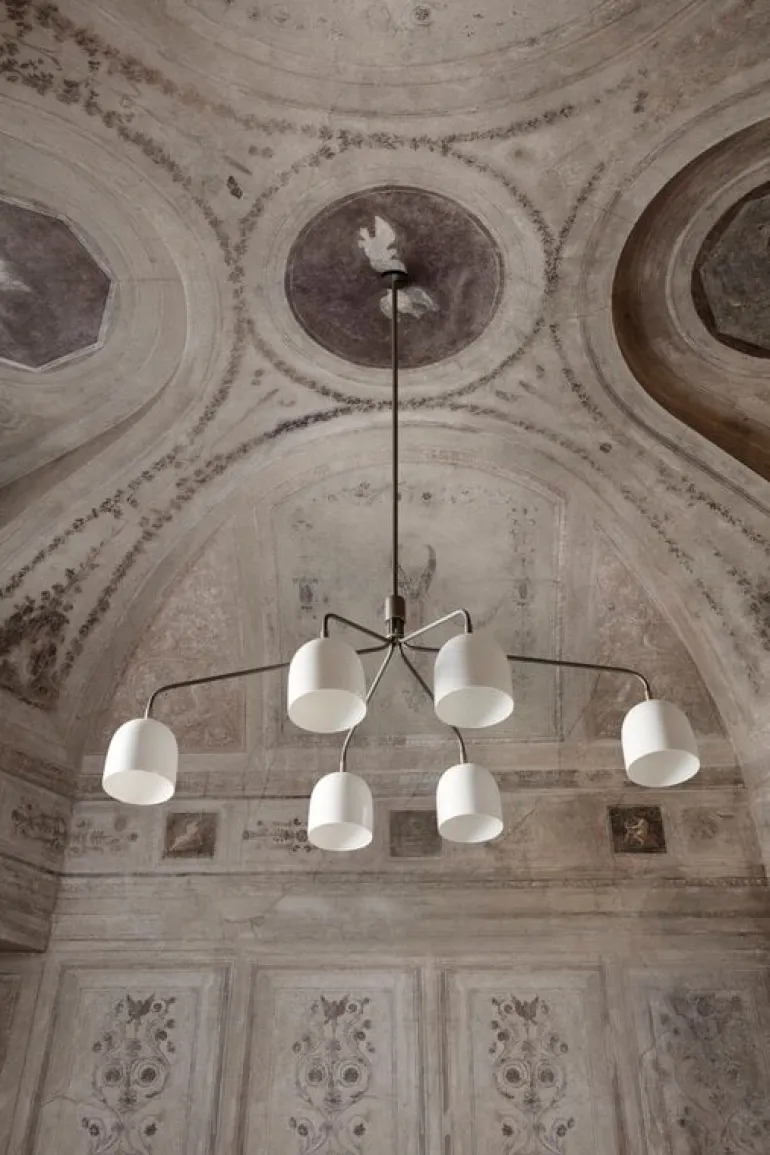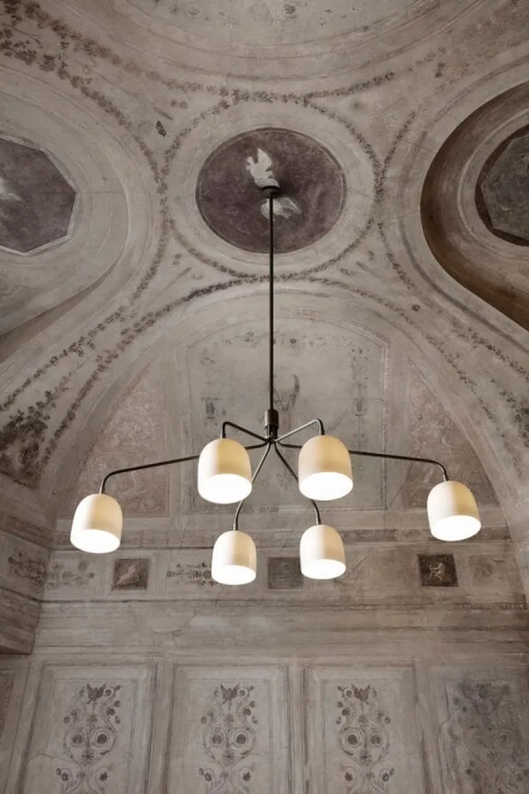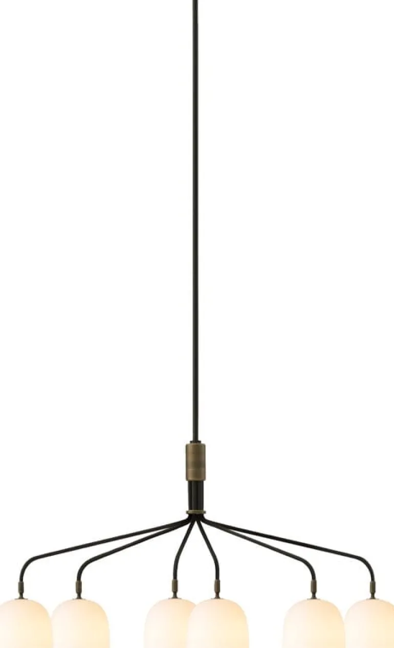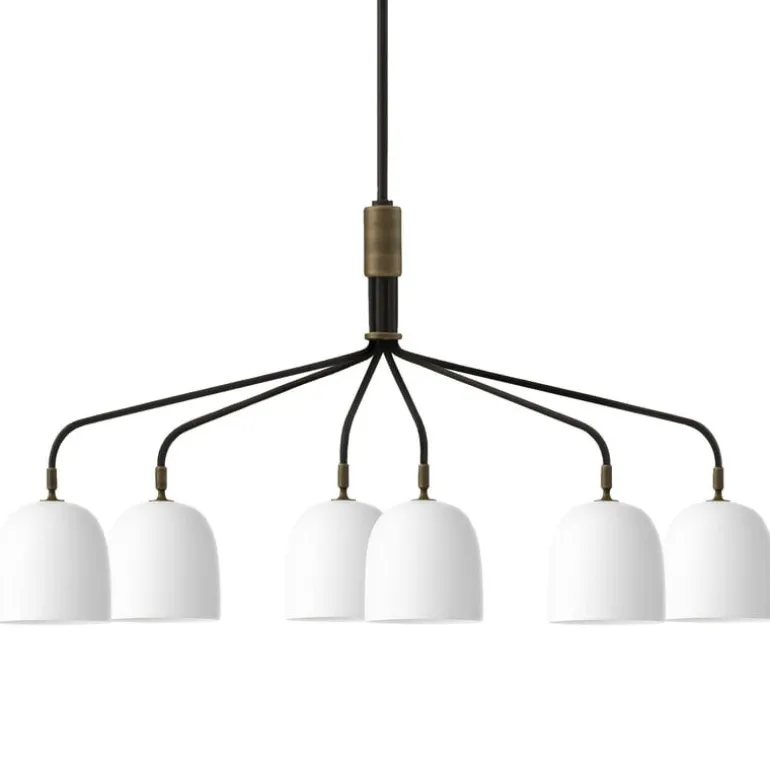 GUBI:s ljuskrona Howard är designad av designduon Space Copenhagen. Inspirerad av New Yorks råa och industriella estetik är Howard en samtida men ändå lyxig blickfångare som skapar en välkomnande atmosfär i ditt hem. Den skulpturala lampan består av slanka armar och sex skärmar i benporslin som skapar ett mjukt, behagligt ljus i rummet. Howard fungerar som en modern ljuskrona både över matbordet och soffgruppen.