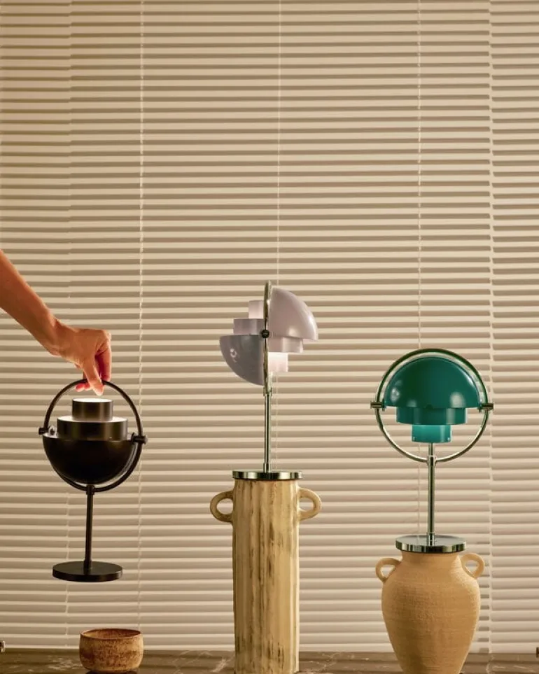 GUBI:s bärbara Multi-Lite är en sladdlös version av den älskade bordslampan som formgavs av Louis Weisdorf 1972, och leker med eleganta geometriska former. Som namnet antyder har lampan flera användningsområden och inställningsmöjligheter: genom att vrida de två skärmarna runt den cylinderformade mittdelen kan ljuset riktas uppåt, neråt och åt sidan. Multi-Lite tillverkades ursprungligen av danska Lyfa och har en tidlös och skulptural metalldesign som är ett djärvt tillägg till många typer av interiörer. Den sladdlösa bordslampan lyser med full ljusstyrka i upp till sex timmar.