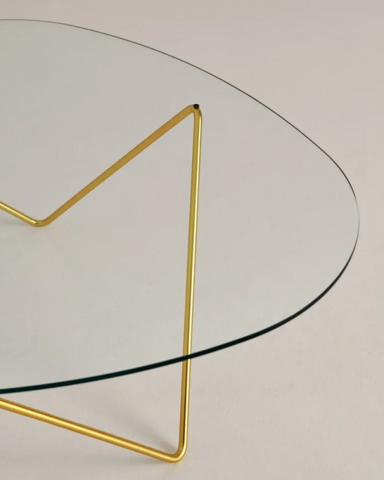 Soffbordet Pedrera har en ram i glänsande mässing och en organiskt formad bordsskiva i glas. Bordet passar perfekt ihop med lamporna i Pedrera-kollektionen, och klarar även av att dra blickarna till sig på egen hand.