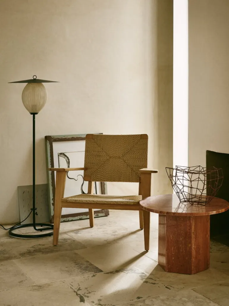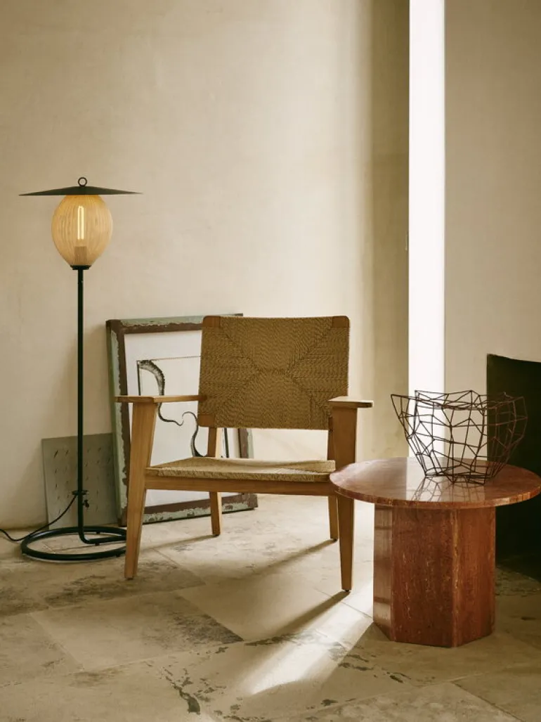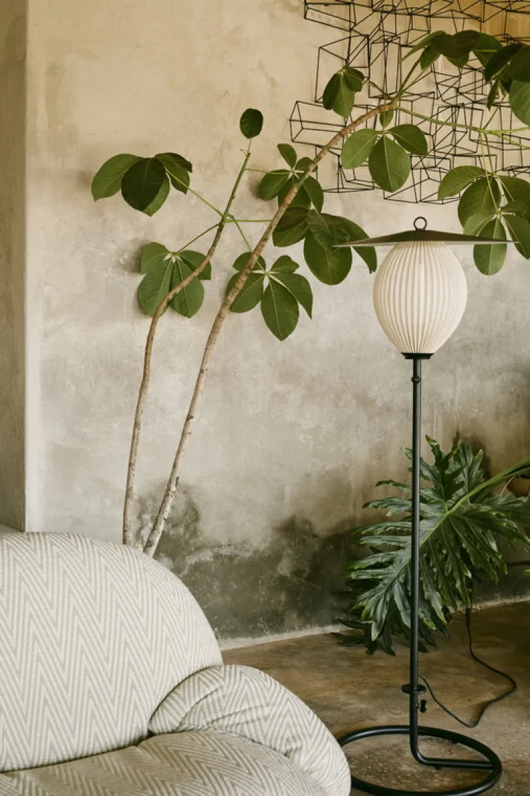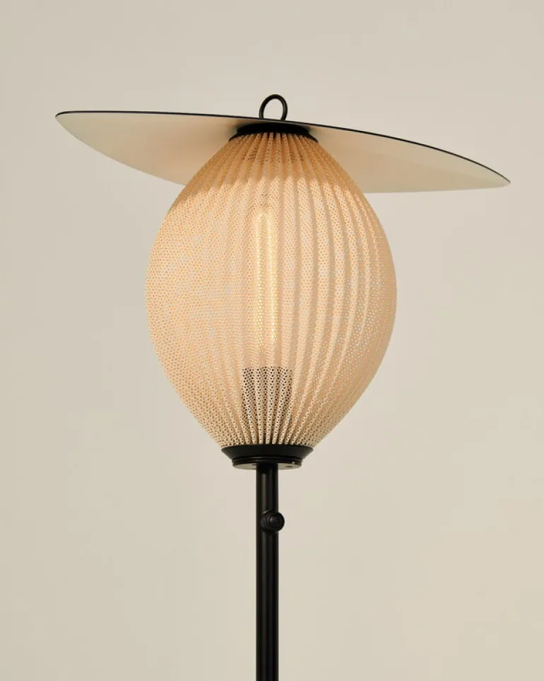 Satellite Outdoor från GUBI är en utomhusvariant av den franska designern Mathieu Matégots ikoniska armatur Satellite, vars original formgavs redan 1953. Den lyktliknande skärmen är ett resultat av Rigitulle, en teknik och ett material som designern själv har uppfunnit: en metallplåt böjs och viks så att en avlång form bildas. Den perforerade och veckade metallskärmen skapar en illusion av mjukt tyg och filtrerar ljuset på ett underbart, festligt sätt. Golvlampan Satellite har en unik och fascinerande design som drar blickarna till sig direkt. Dess namn är Matégots hyllning till de vetenskapliga framstegen i Frankrike efter andra världskriget.