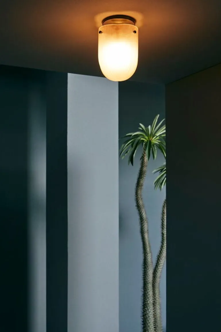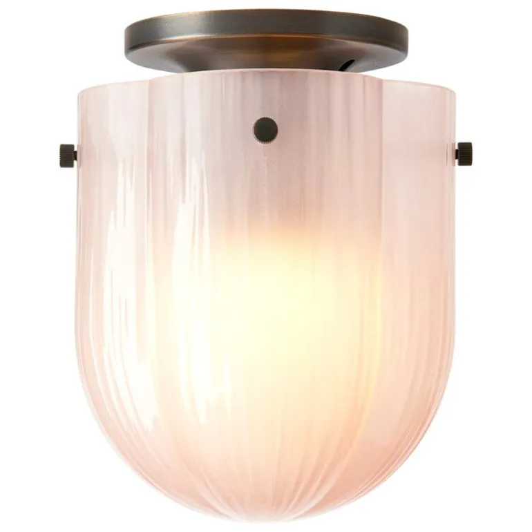 Taklampan Seine från GUBI för tankarna till flodbanken i Paris. Lampan Seine, som är formgiven av Space Copenhagen, har en kupol av böljande glas med inspiration från lekande ljus och flödande vatten. Den klöverformade glasskärmen tillverkas för hand genom att blåsa glas in i en form. Skärmen har en sandblästrad, korallfärgad yta som ger ett mjukt och lite suddigt ljus. Lampans kropp är tillverkad i mörk antik mässing och den dimbara ljuskällan ligger inuti en mindre, rund glaskula.