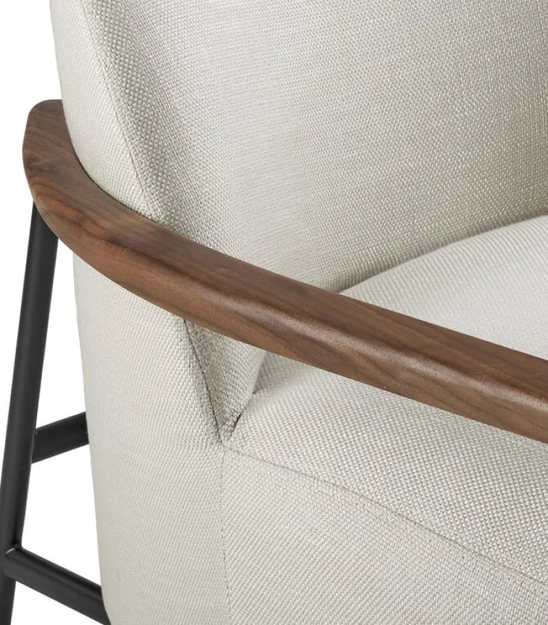 Fåtöljen Sejour från Grubi karakteriseras av kontrasterna mellan olika former och material: den slanka ramen håller uppe en omfångsrik sits och ett bekvämt, rundat ryggstöd, med enkla armstöd i trä som pricken över i.