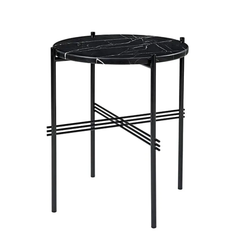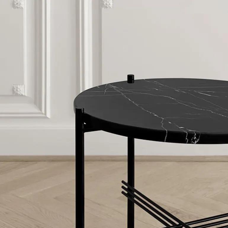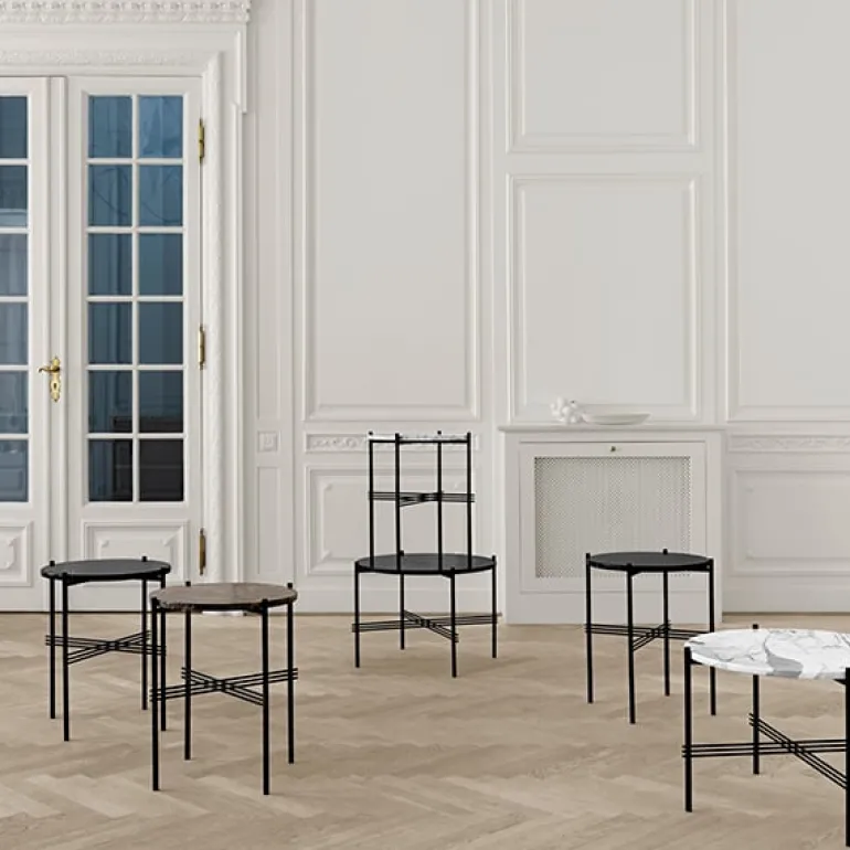 TS från Gubi är en kollektion eleganta soffbord, som designats av den dansk-italienska formgivarduon GamFratesi för att ingå i inredningen i entrén och sällskapsrummen på Michelin-restaurangen The Standard i Köpenhamn. Formgivarna fick inspiration till den vackra designen från den byggnad som på 1930-talet inhyste restaurangen: en rund bordsskiva i marmor vilar på smala metallben som korsas av iögonfallande stänger. Placera ett stort TS-bord framför en soffa och en mindre version bredvid en fåtölj, eller prova dig fram genom att blanda olika färger och storlekar för att skapa en varierad grupp med bord.