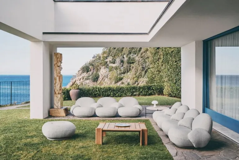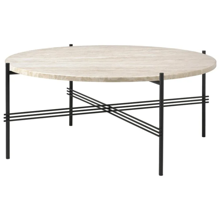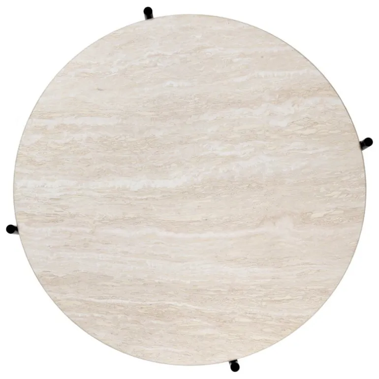 TS utomhus soffbord från GUBI kombinerar en elegant metallbas med en rund topp i travertin, vars unika ådring och färger gör varje bord till ett unikt konstverk. Bordet passar både för inomhus- och utomhusbruk och är en utmärkt följeslagare till en loungegrupp, oavsett om den står i vardagsrummet eller ute på uteplatsen eller i trädgården.