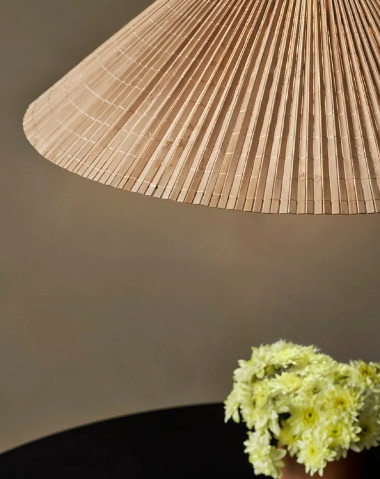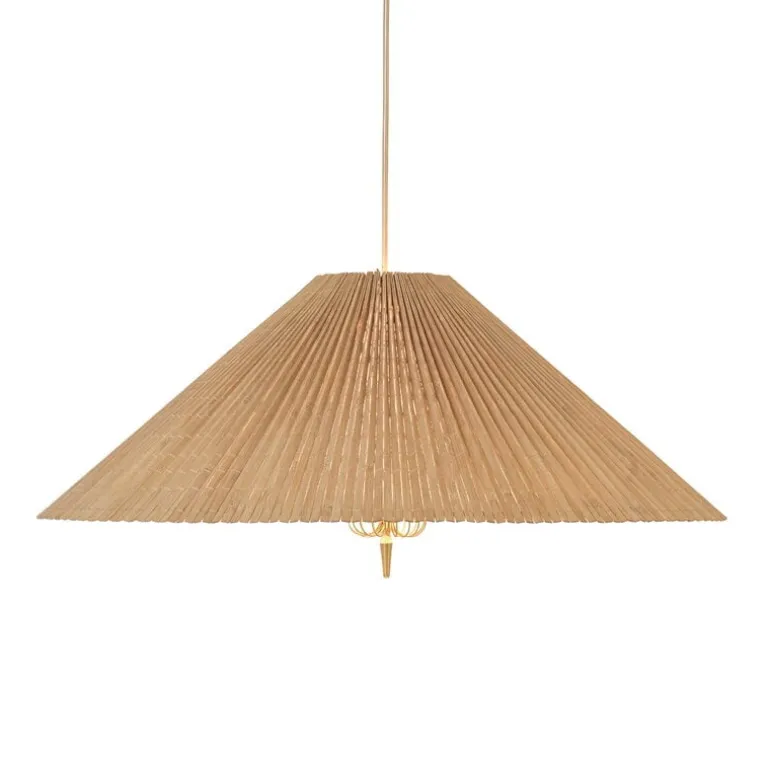 GUBI:s pendellampa Tynell 1972 ingår i Paavo Tynells belysningskollektion som består av koniskt formade lampskärmar och karaktärsfulla naturmaterial, båda typiska för formgivaren. Lampskärmen är gjord för hand av bambuspjälor som avger ett varmt sken. Den här lampan är något bredare än de mindre 1967-modellerna som också ingår i serien. Diffusern i tyg är placerad under ljuskällan, som gör att det neråtriktade ljusskenet blir milt och bländfritt. Pendellampan passar därför perfekt på alla möjliga platser, från matsalen till sovrummet eller som allmänbelysning i valfritt rum. Utsmyckningen i polerad mässing ger utförandet en elegant touch.