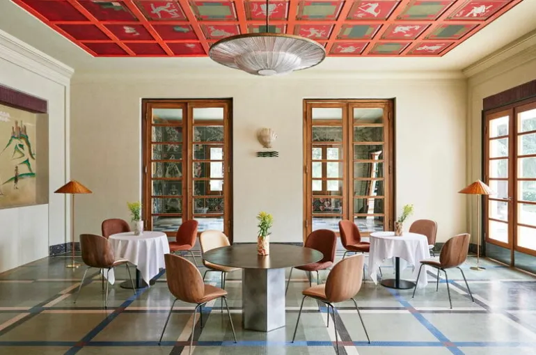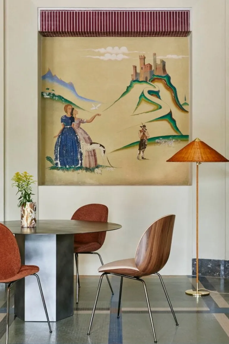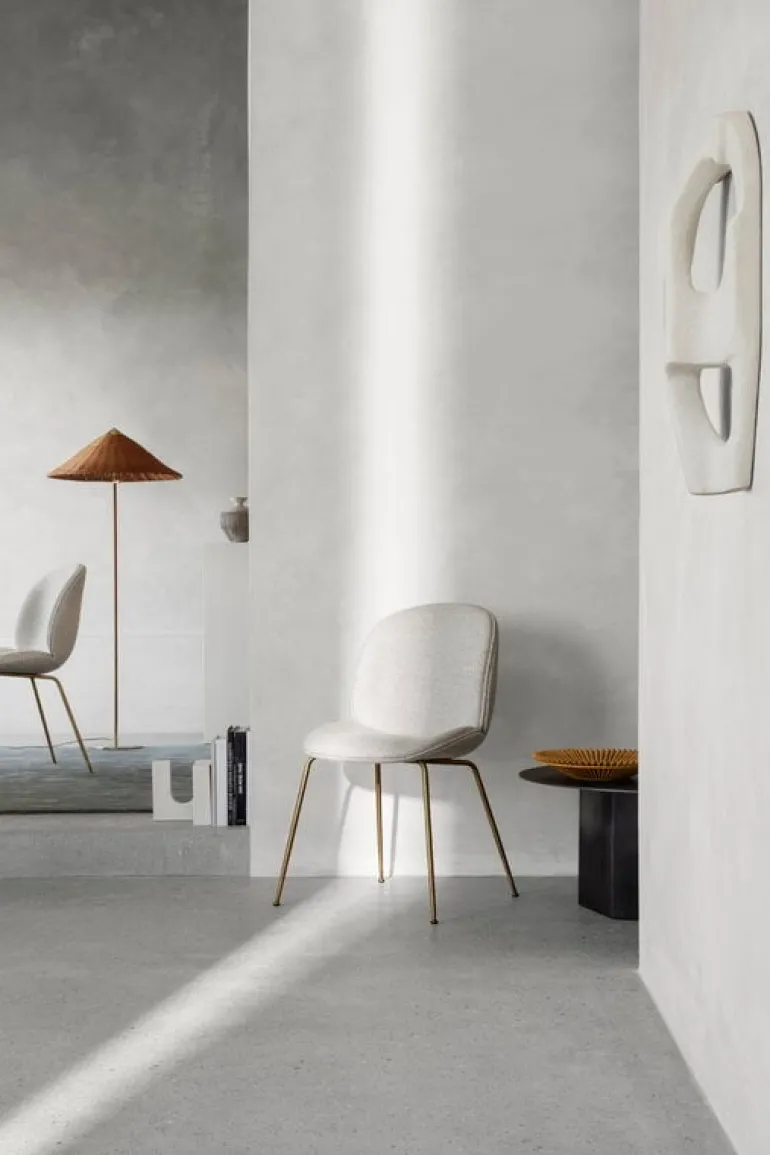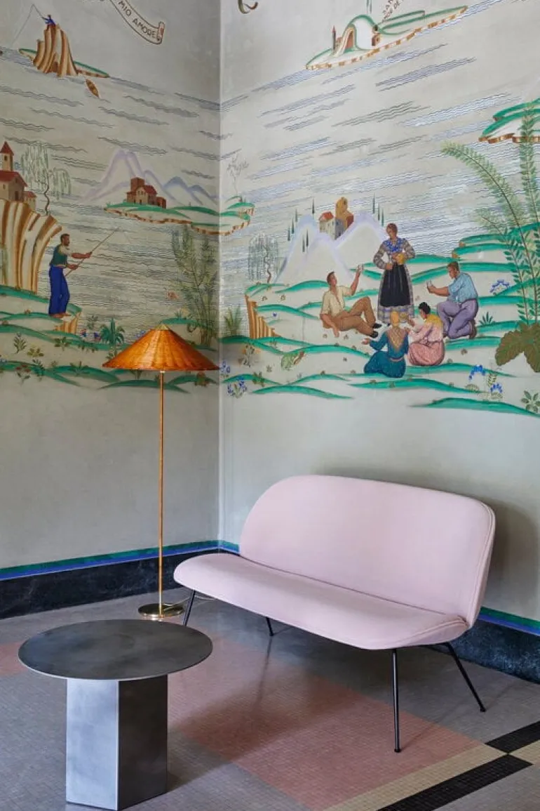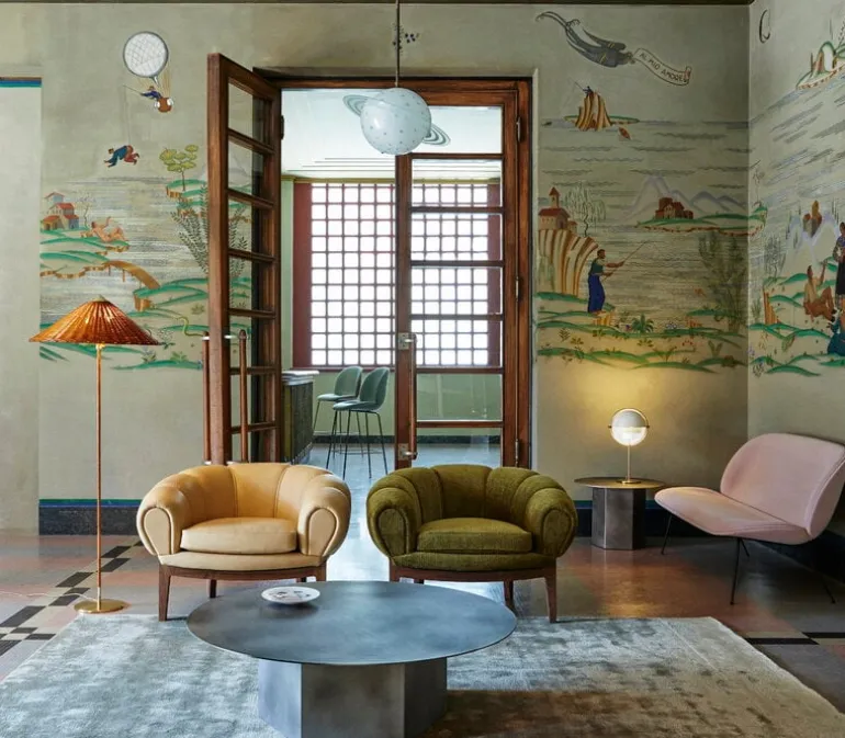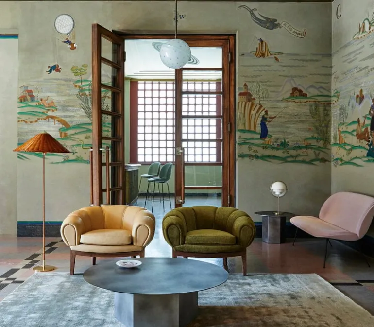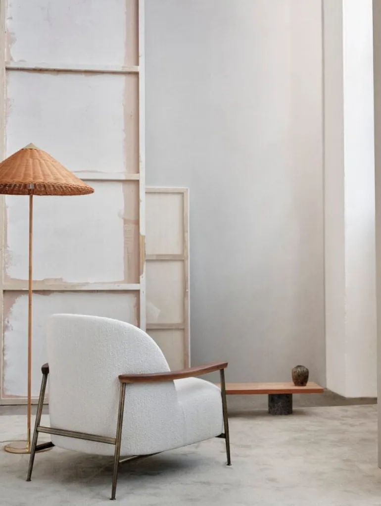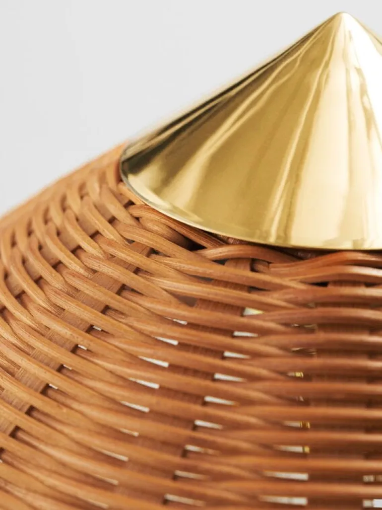 Den finska belysningsdesignern Paavo Tynell skapade golvlampan 9602 för hotellet Aulanko i Tavastehus, Finland år 1935. Lampan kännetecknas av en bred skärm som liknar en traditionell kinesisk hatt och en smal, rottingklädd fot som kontrasteras av glänsande mässing i basen och på toppen av lampskärmen. 9602-lampan är ett utmärkt exempel på Tynells förmåga att förvandla belysning till konst och kombinera olika material sömlöst. Armaturen är en del av Paavo Tynell-kollektionen som släpptes 2018 av det danska designmärket Gubi.