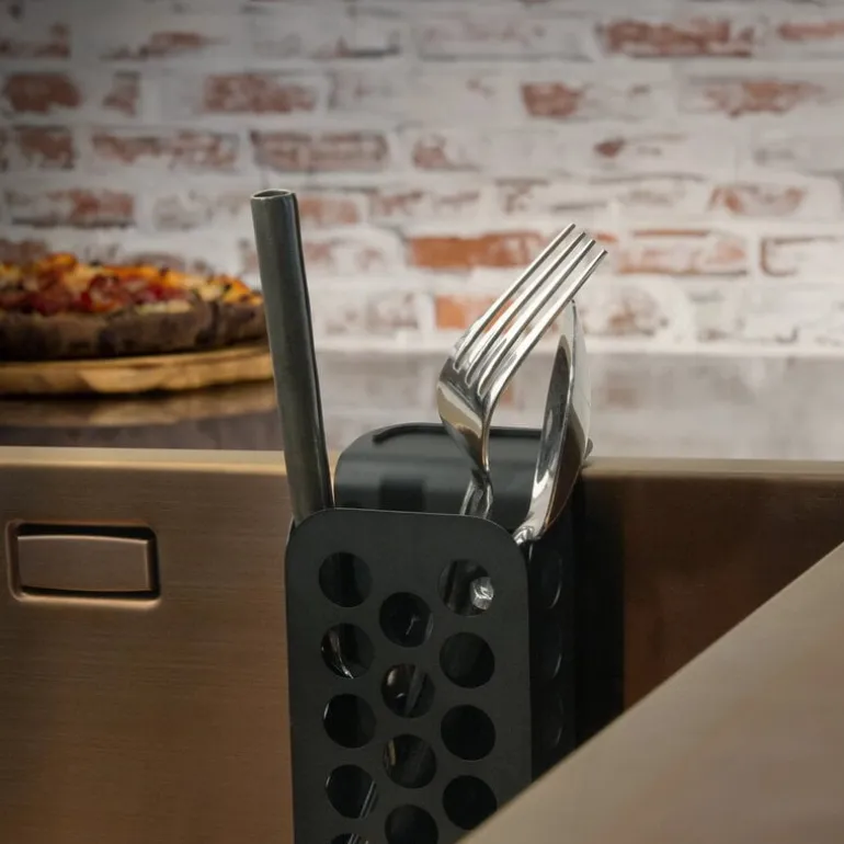 Happy Sinks bestickkorg hjälper dig att hålla ordning i köket. Den praktiska korgen gör att gafflar, knivar och skedar torkar snabbt och hygieniskt. Då slipper man låta dem torka i skåpet eller på bredvid diskbänken. Vattnet rinner direkt ner i diskhon så att det inte blir några små, irriterande vattendroppar överallt i köket. Korgen är tillverkad i rostfritt stål och är avsedd för bestick, men kan även användas för att torka extra disktrasor och svampar i köket. Den praktiska bestickkorgen passar i alla diskhoar.