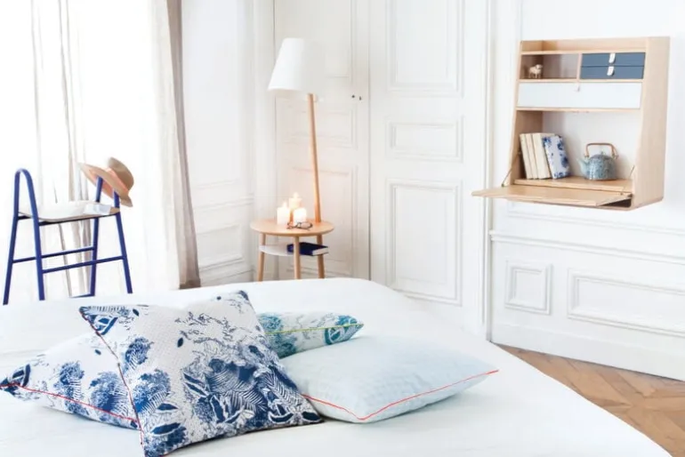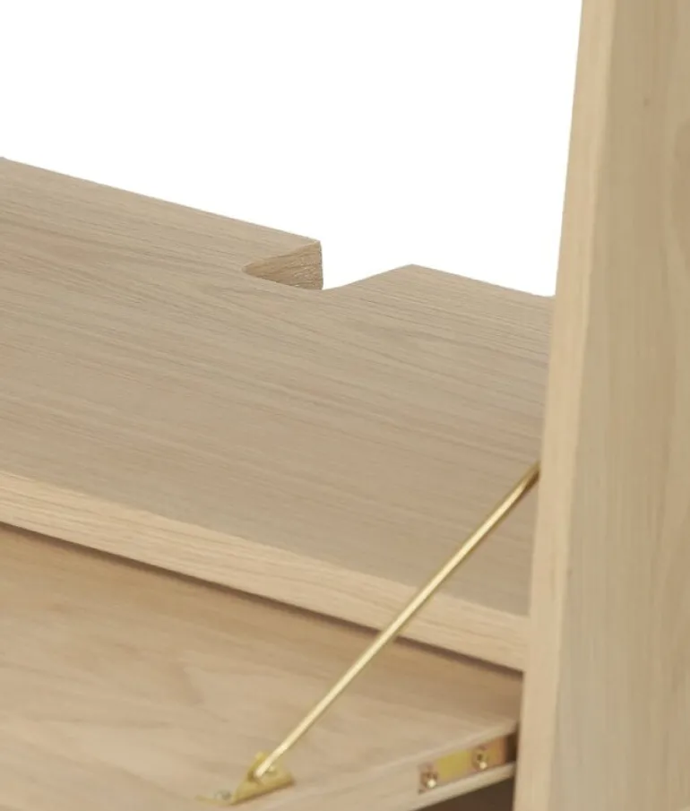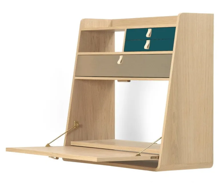 Hartôs väggskrivbord Gaston kommer att glädja dig med sin mångsidighet. Den stiliga förvaringsenheten kan användas i sin traditionella roll som en hylla eller, mer överraskande, som ett skrivbord. Det fällbara bordet är enkelt att dra ut och stänga när det inte längre behövs. Gaston väggskrivbord är idealiskt för ett mindre hemmakontor men fungerar också bra som extra väggyta på företagets kontor. Hyllor och tre lådor säkerställer att det finns gott om förvaringsutrymme för viktiga papper, tidskrifter och andra små föremål. Gastons utseende fulländas av de eleganta läderhandtagen på lådorna, designat av Florence Watine.