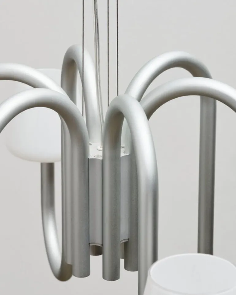 Ljuskronan Apollo från HAY består av en härlig blandning av traditionella och moderna inslag. Den moderna ljuskronan har skapats av Studio 0405 och består av sex bågformade armar med lampskärmar av opalglas, där de munblåsta, organiska formerna skapar en lekfull kontrast till aluminiumrören med sin industriella framtoning.